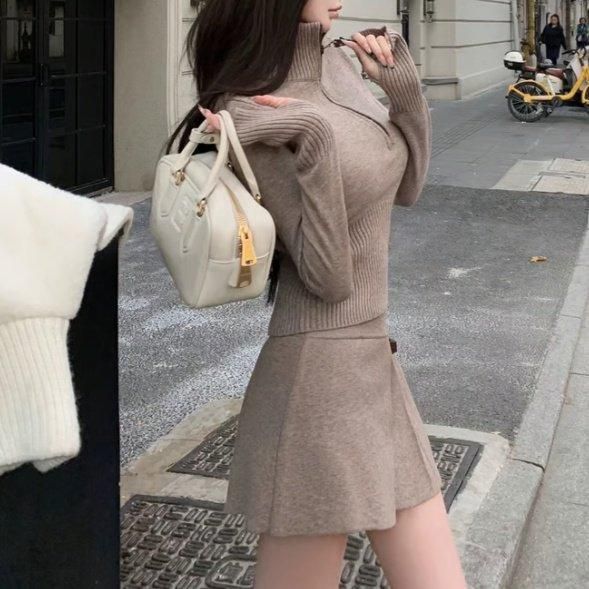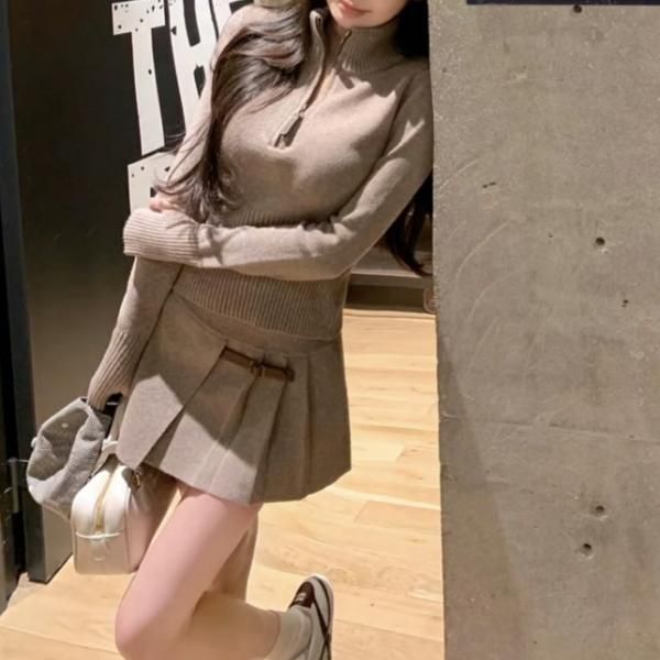 2色展開 ハイネック ハーフジッパー ジップアップ ファスナー ニット セーター トップス プリーツミニスカート セットアップが入荷しました。