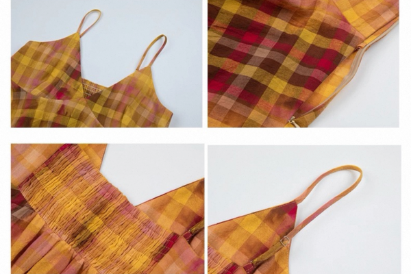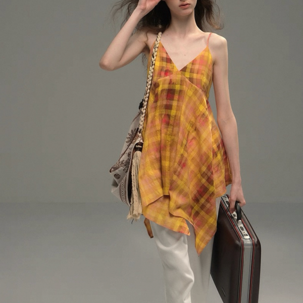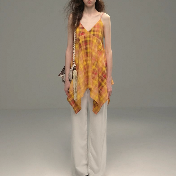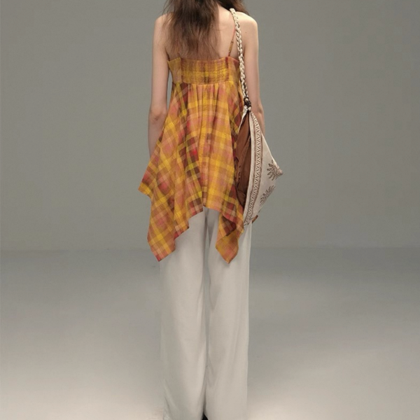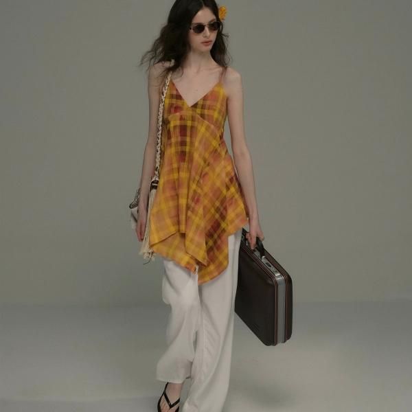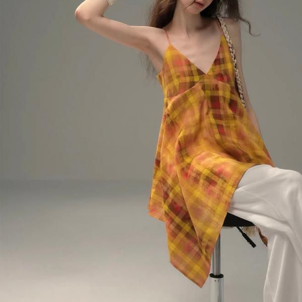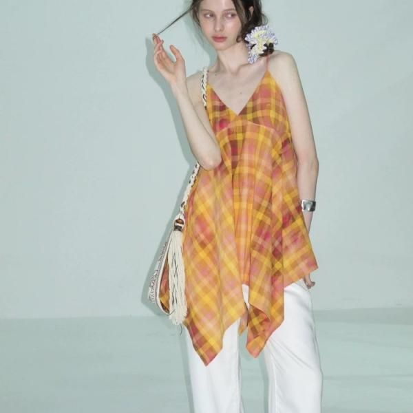 UNSOYAO オレンジ プレイドチェック柄 アシンメトリーヘム キャミソール チュニック ロング丈 トップス ミニワンピース ワンホンが入荷しました。