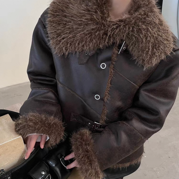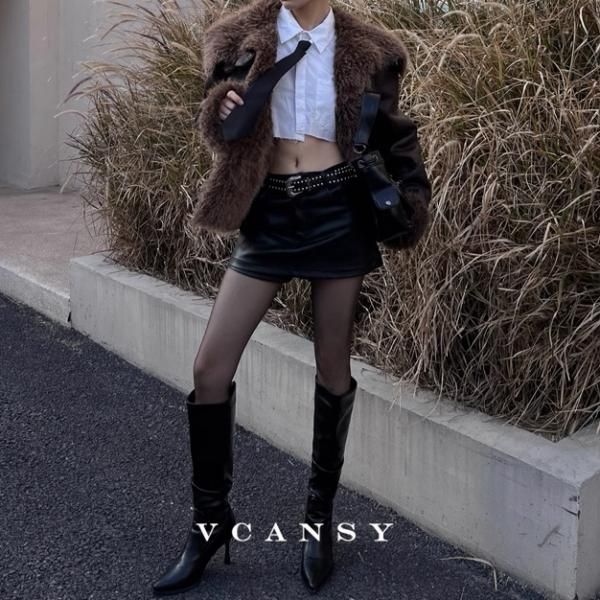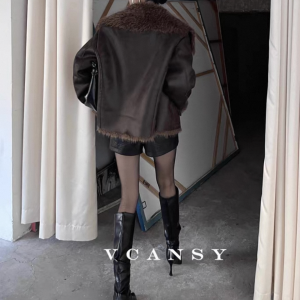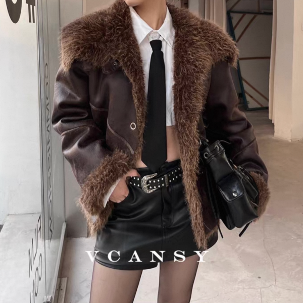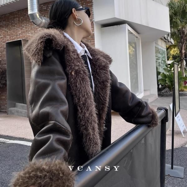 Vcansy ブラウン ファートリム ファーカラー ファー襟 レザーブルゾン レザージャケット オーバーサイズ ビッグラペルジャケット ワンホンが入荷しました。
