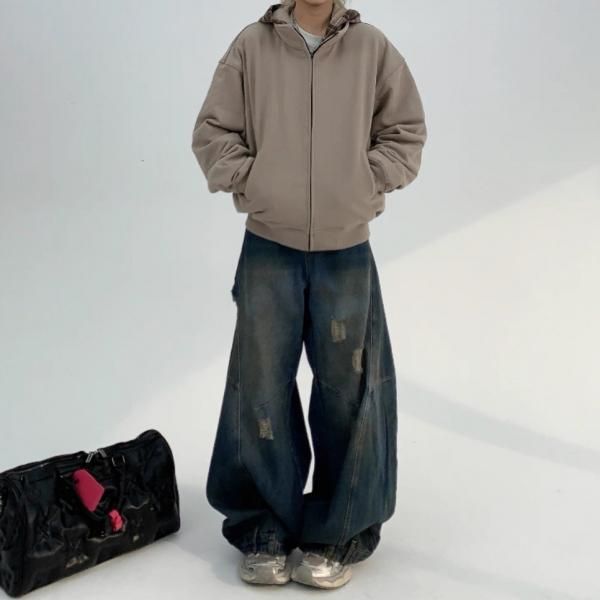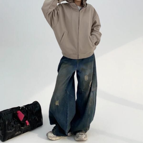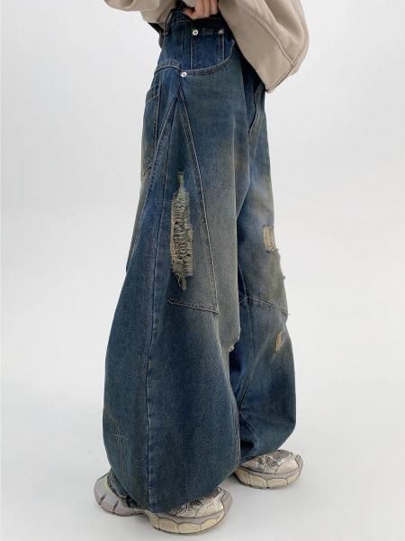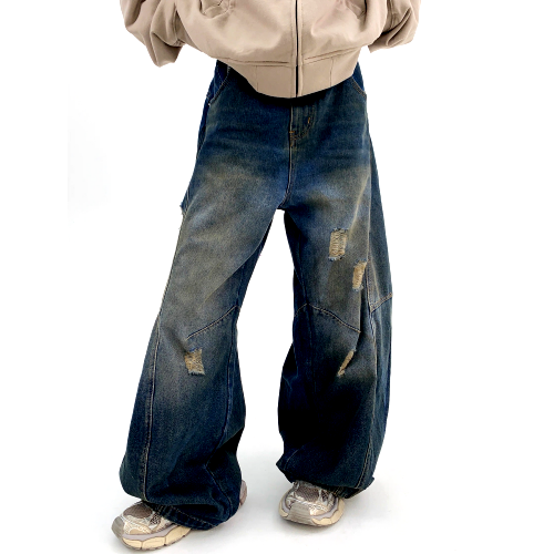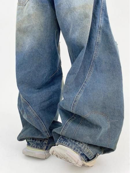 Youlaile studio RICE CAKE OISIS ブルー ビンテージ風 ウォッシュ加工 ブロークン ダメージ加工 クラッシュ加工 ストレートパンツ ワイドパンツ ロングパンツ ワイドレッグデニムパンツ ジーンズが入荷しました。