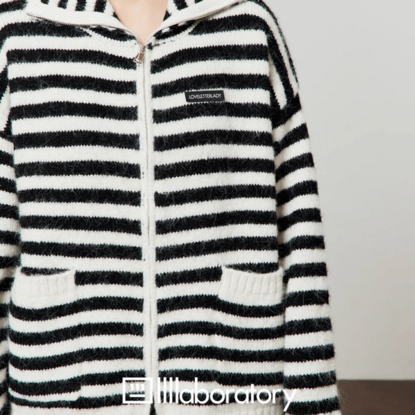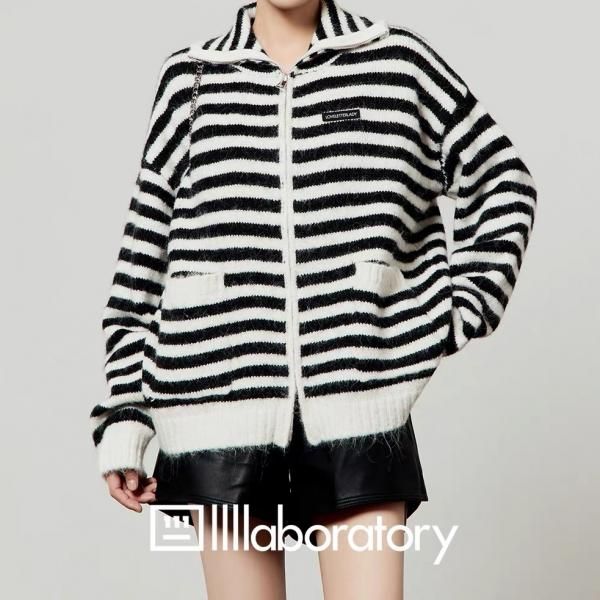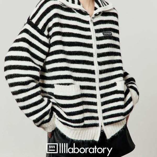 LLL LAB ストライプ モノトーン ボーダー ニットパーカー ニットジャケット フーディー ジッパー ジップアップ ファスナーが入荷しました。