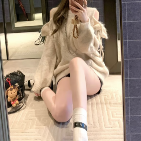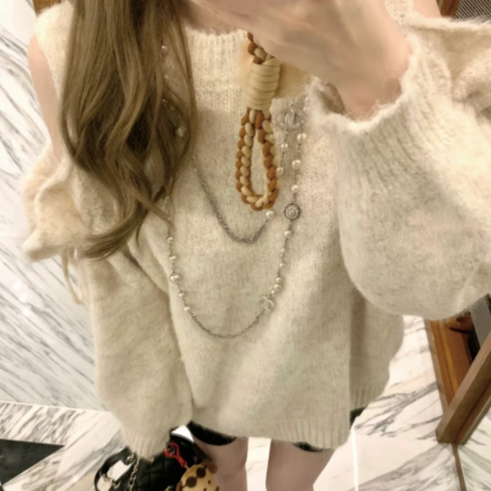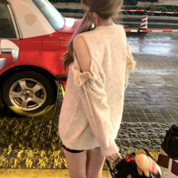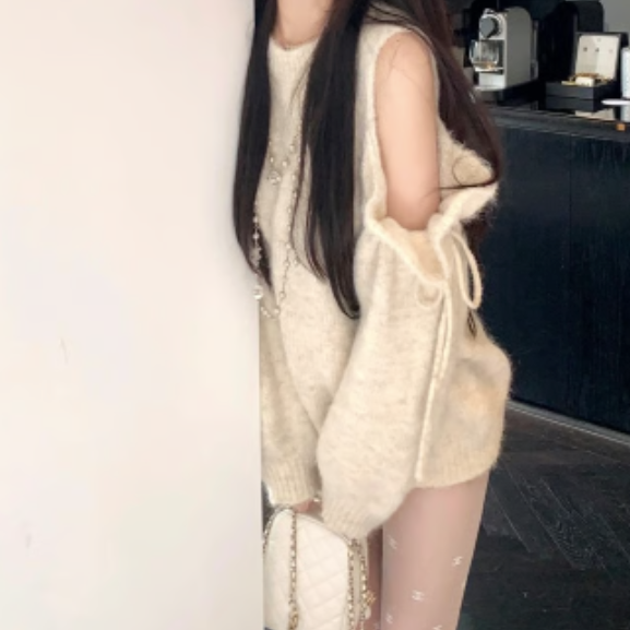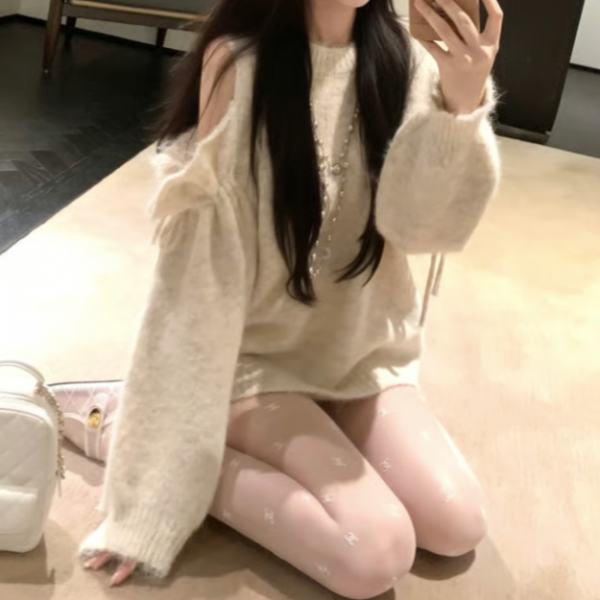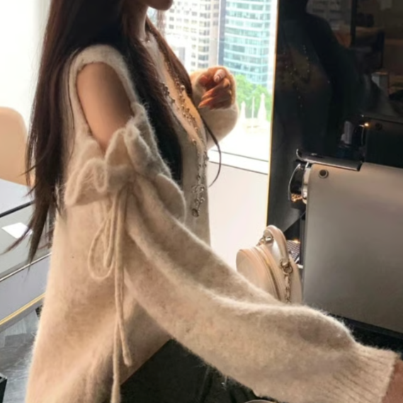 ベージュ モヘア フェイクファー コールドショルダー オフショルダー ラッフルフリル リボン ニット セーター トップス プルオーバーが入荷しました。
