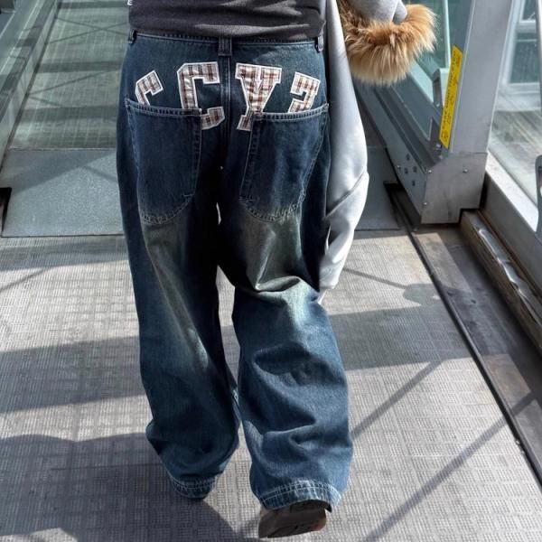CCYE ダークブルー ビンテージ風 ウォッシュ加工 バックロゴプリント チェック柄 ストレートデニムパンツ ジーンズ ユニセックス ロングデニムパンツ ワンホンが入荷しました。