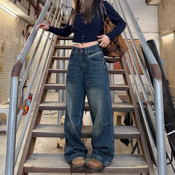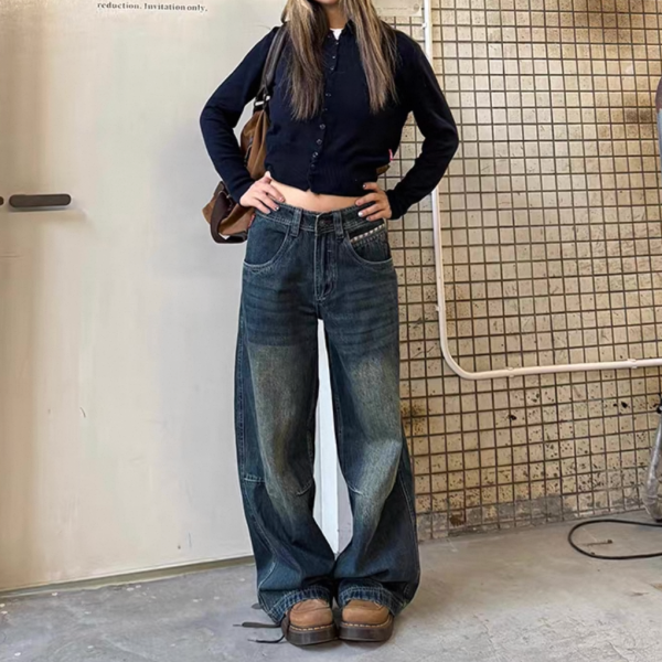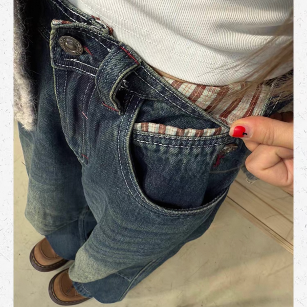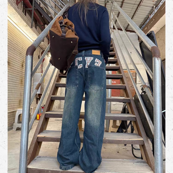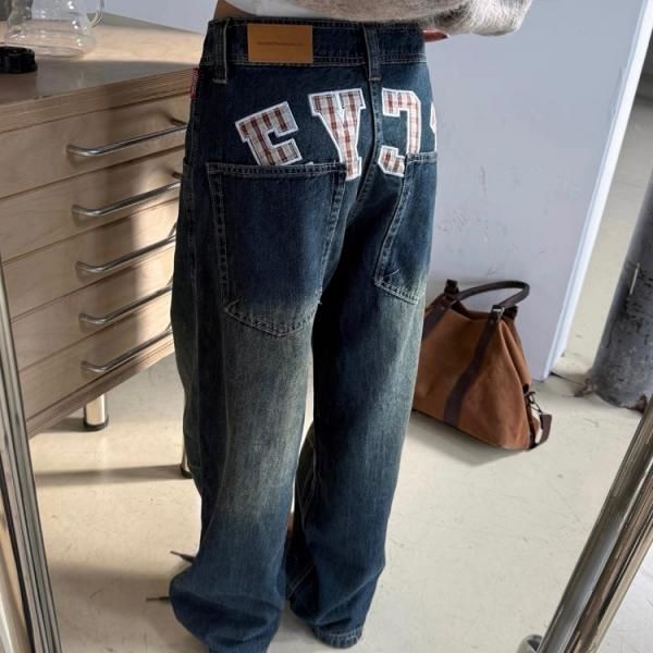 【大特価】CCYE ダークブルー ビンテージ風 ウォッシュ加工 バックロゴプリント チェック柄 ストレートデニムパンツ ジーンズ ユニセックス ロングデニムパンツ ワンホン