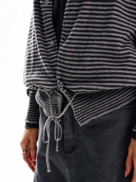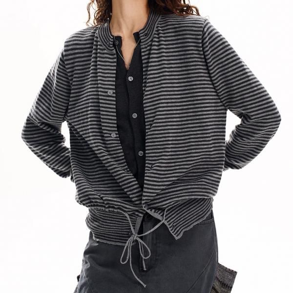 H GANG X グレー ストライプ ボーダー レイヤード 重ね着風 クルーネック 長袖 フロントボタン ニットカーディガン セーター トップス カットソー ワンホンが入荷しました。
