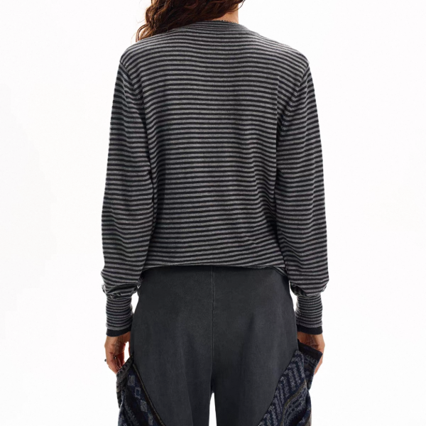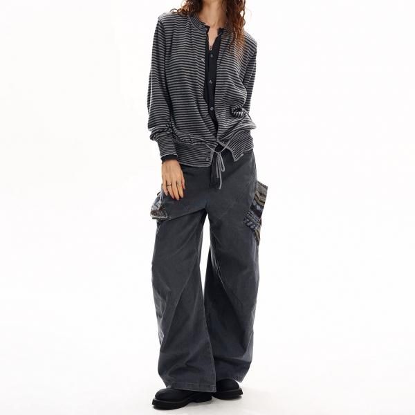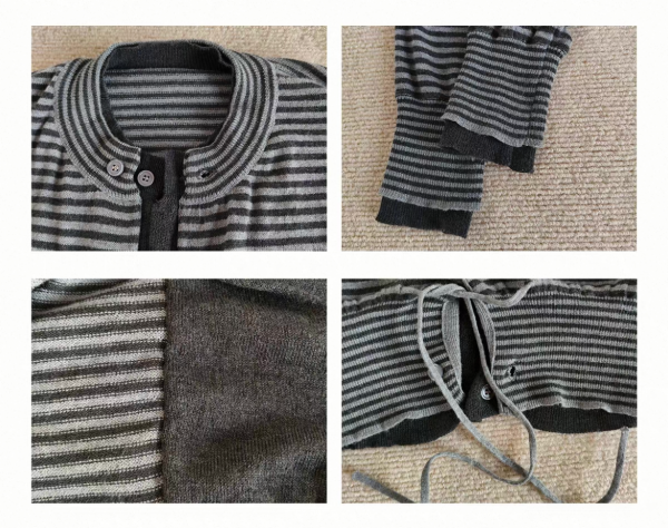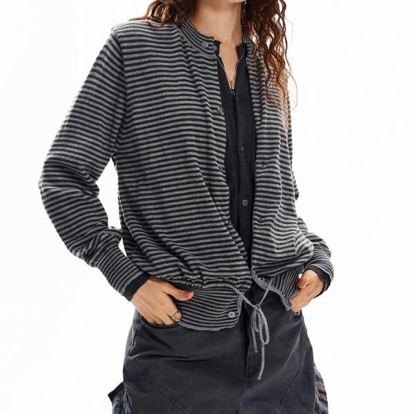 【大特価】H GANG X グレー ストライプ ボーダー レイヤード 重ね着風 クルーネック 長袖 フロントボタン ニットカーディガン セーター トップス カットソー ワンホン