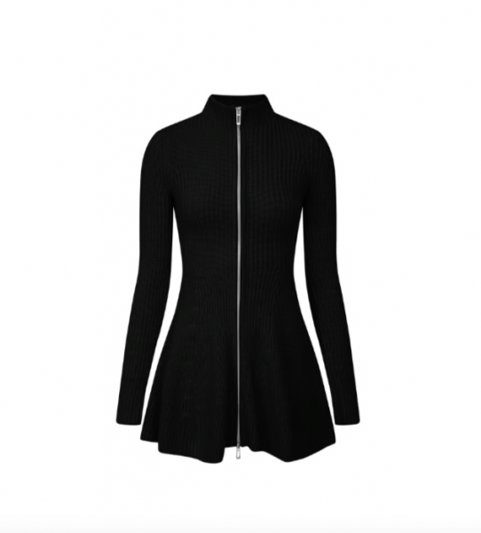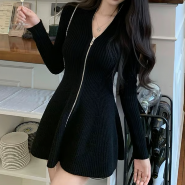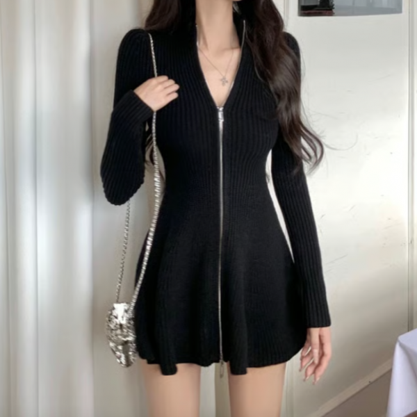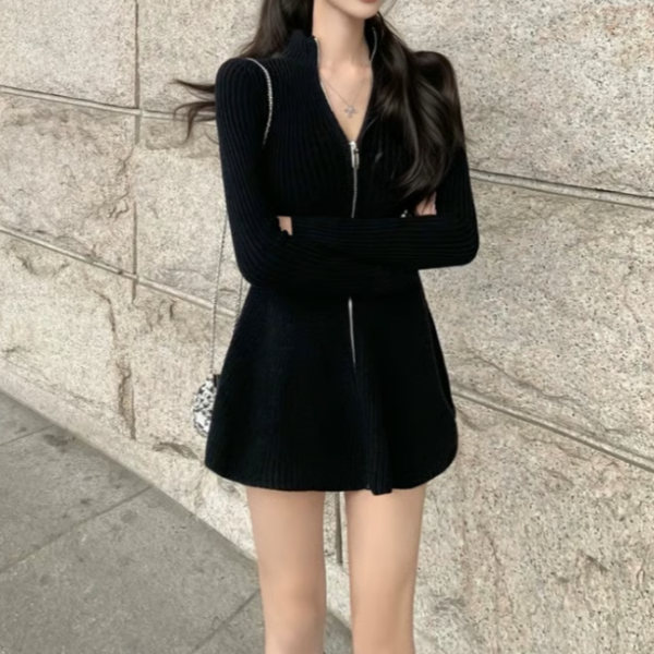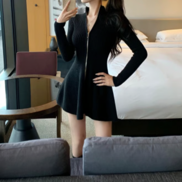 ブラック 無地 シンプル フロントジッパー ジップアップ ファスナー 長袖 タイトワンピース ミニワンピース フレアワンピース ニットワンピース スタンドカラーが入荷しました。