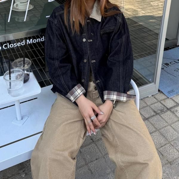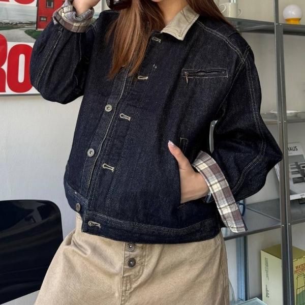 【大特価】CCYE インディゴ ネイビー レイヤード 重ね着風 チェック柄 バイカラー 切替デザイン デニムジャケット ユニセックス トラッカージャケット ワンホン