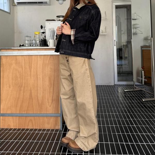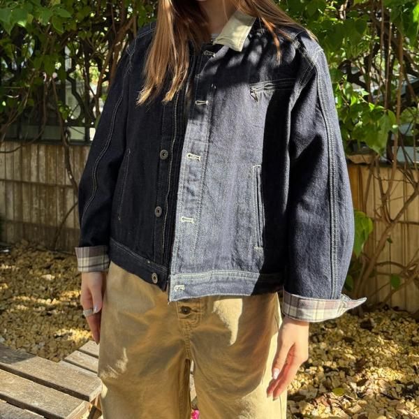 CCYE インディゴ ネイビー レイヤード 重ね着風 チェック柄 バイカラー 切替デザイン デニムジャケット ユニセックス トラッカージャケット ワンホンが入荷しました。