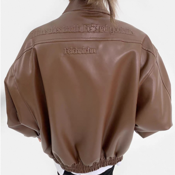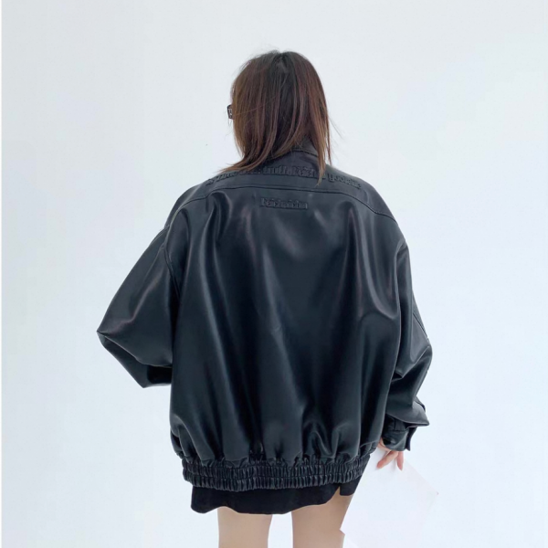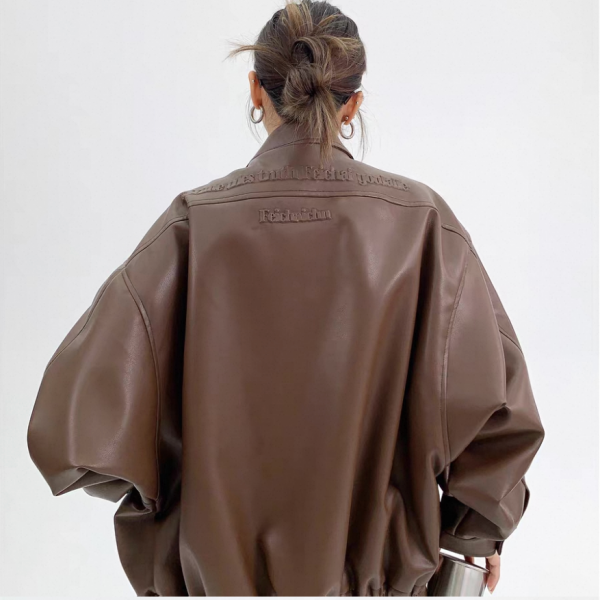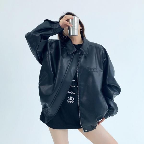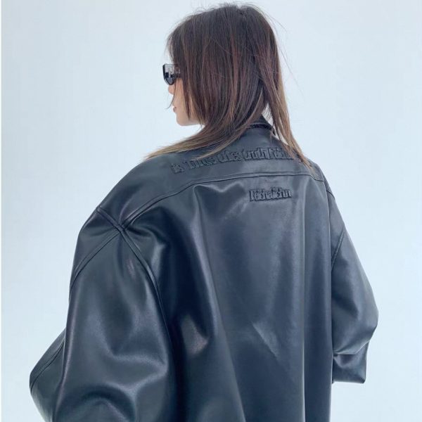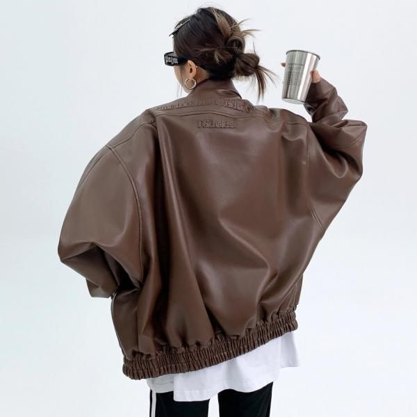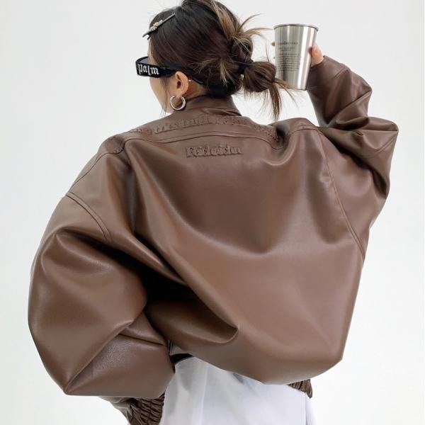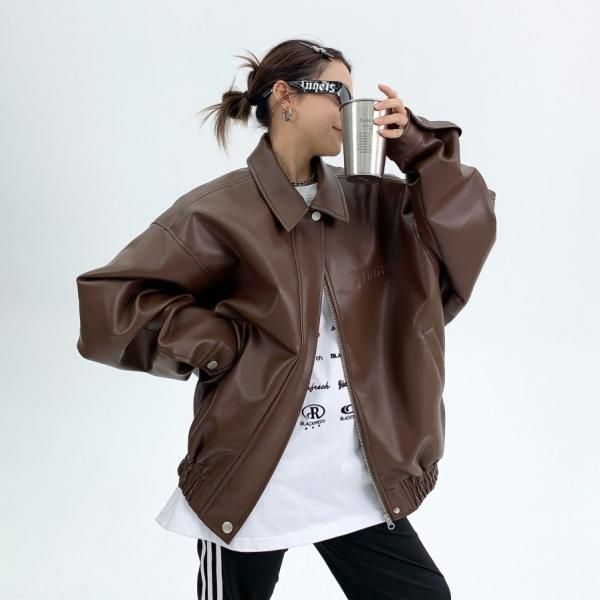 Youlaile studio RICE CAKE OISIS 2色展開 エンボスロゴ 襟付き オーバーサイズ ビンテージ風 フェイクレザー 合皮 レザージャケット レザーブルゾン ワンホン が入荷しました。