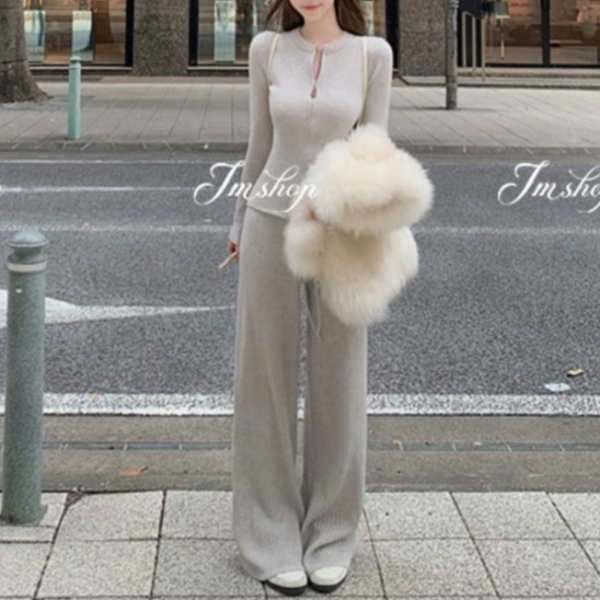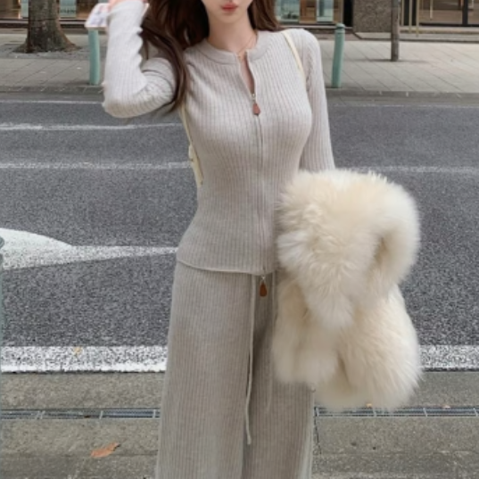 グレー 無地 シンプル リブデザイン フロントジッパー ジップアップ ファスナー ニット セーター トップス ワイドパンツ ロングパンツ ニットパンツ セットアップ ニットアップが入荷しました。