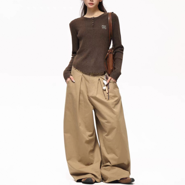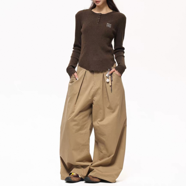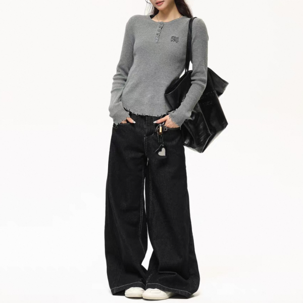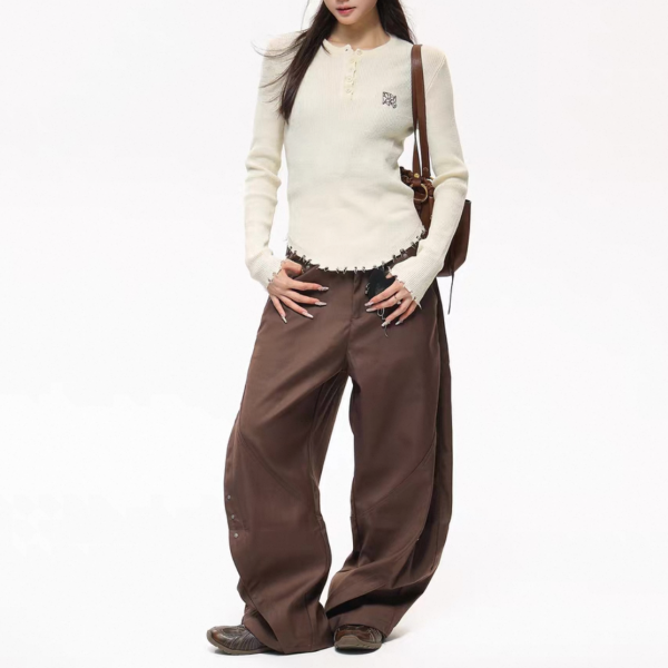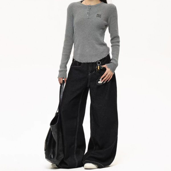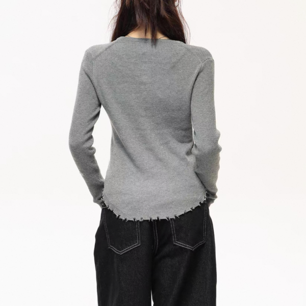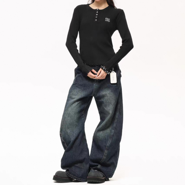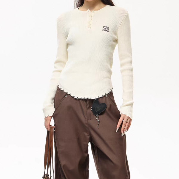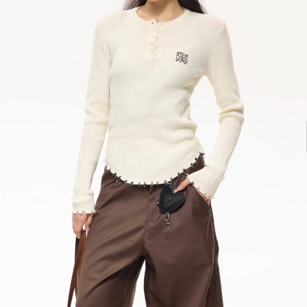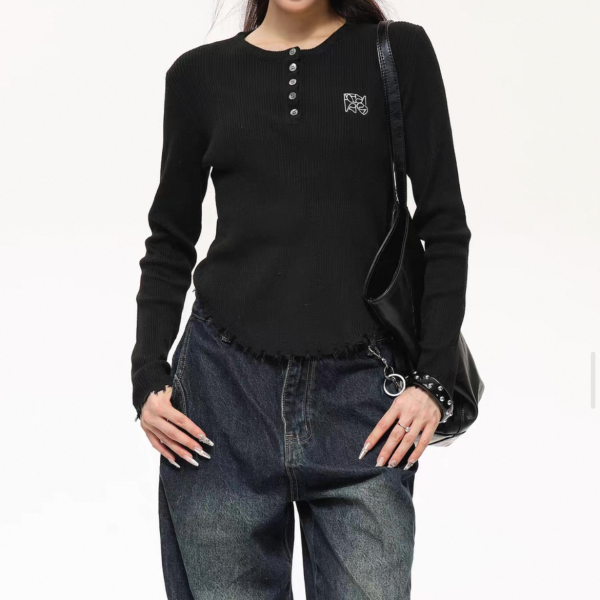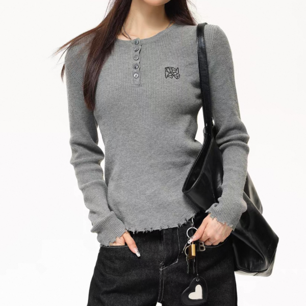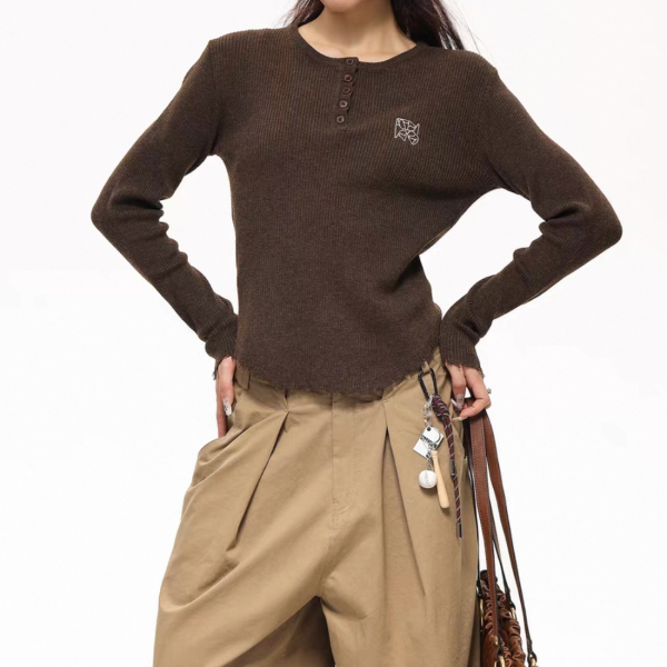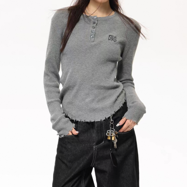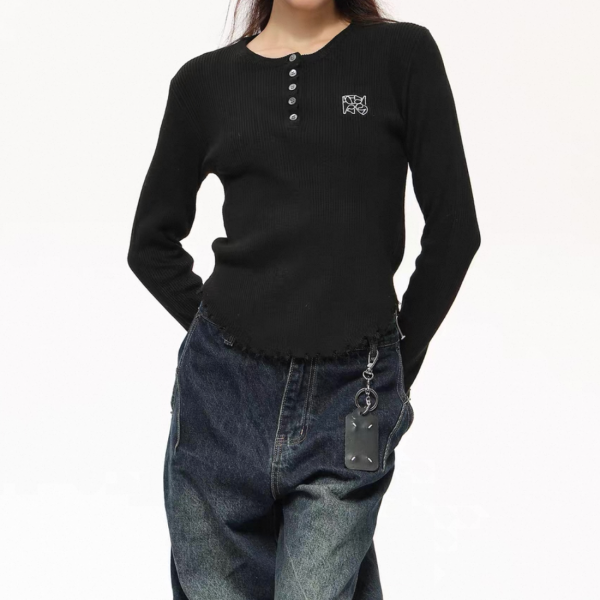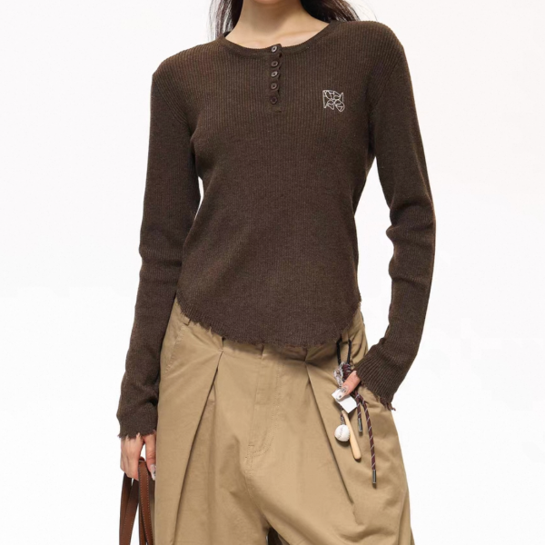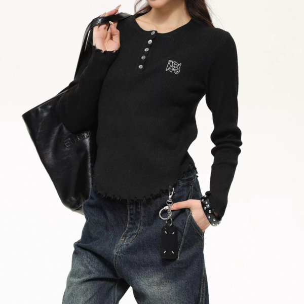 AceStudios 4色展開 無地 シンプル 刺繍デザイン フロントボタン ヘンリーネック 長袖 メロウヘム トップス カットソー ワンホンが入荷しました。