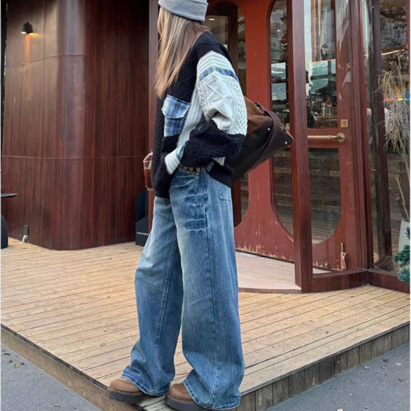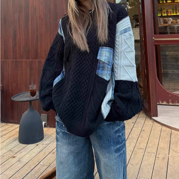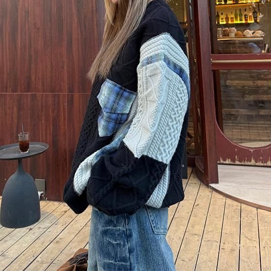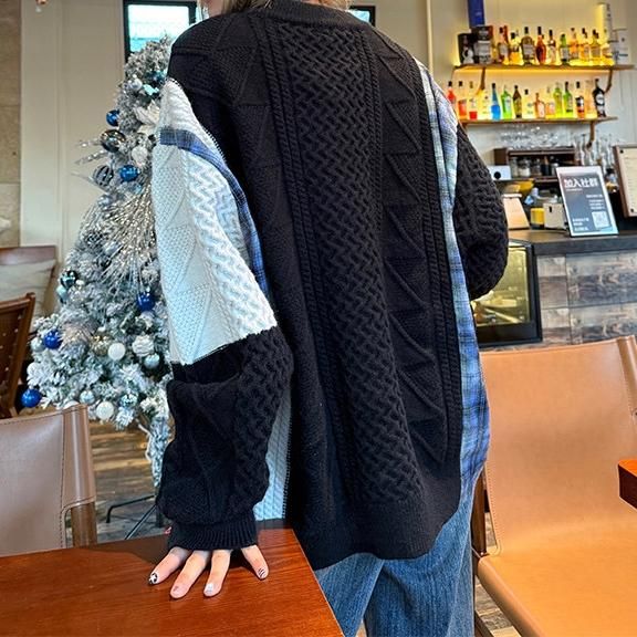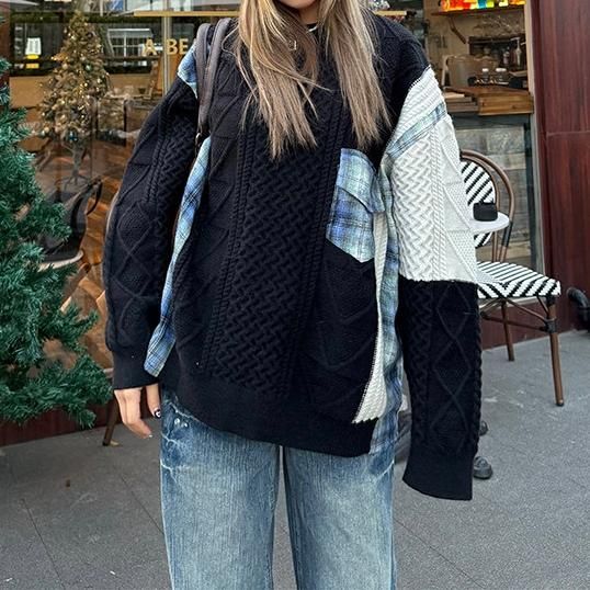 【大特価】CCYE ブラック ケーブル編み 異素材切替 チェック柄 レイヤード 重ね着風 ニット セーター トップス プルオーバー ワンホン