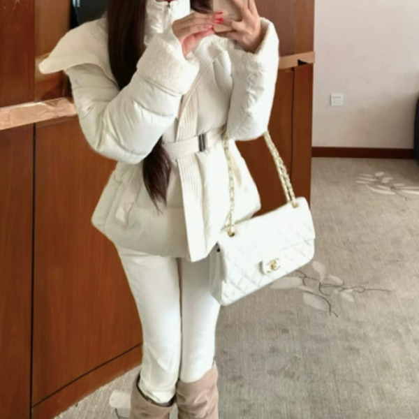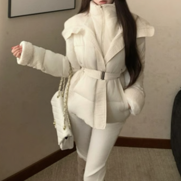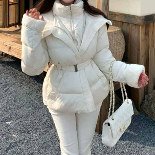 【大特価】ホワイト ウエストマーク ウエストベルト レイヤード 重ね着風 スタンドカラー ビッグカラー ジッパー ジップアップ ファスナー ダウンジャケット パファーージャケット 韓国