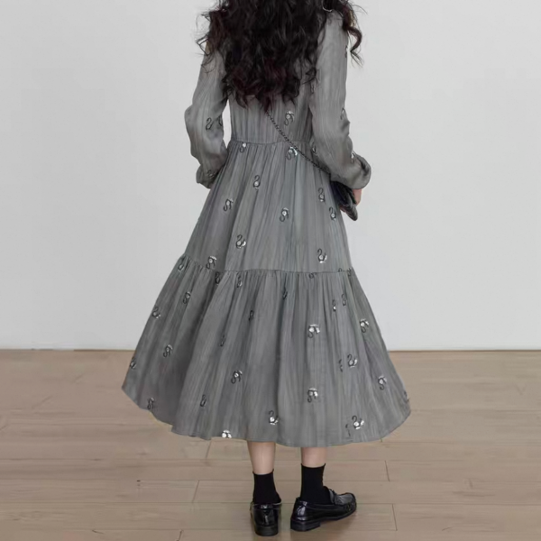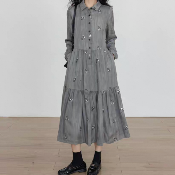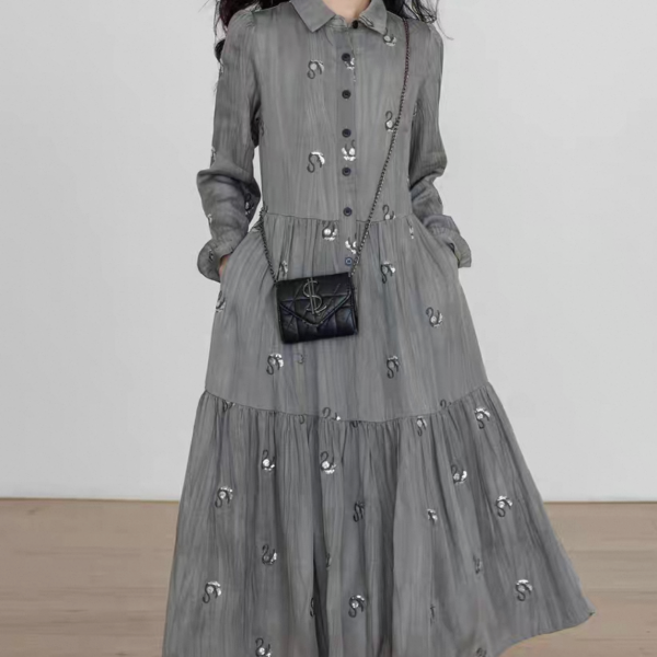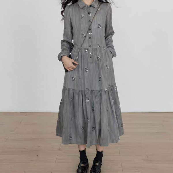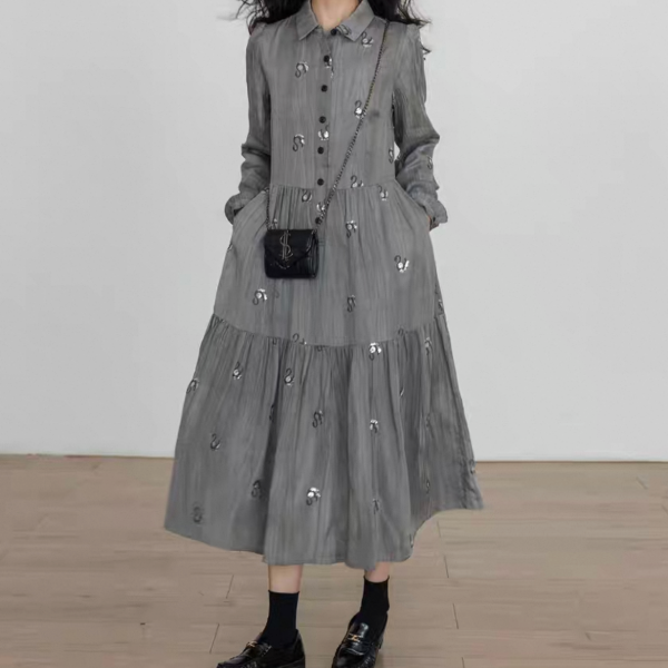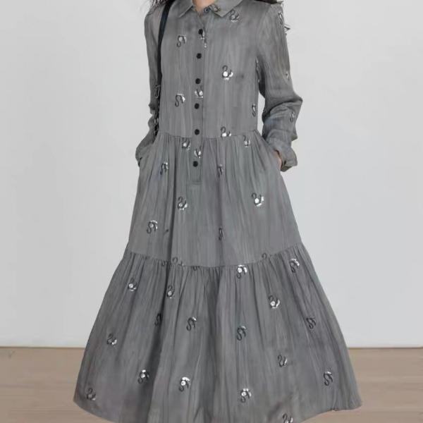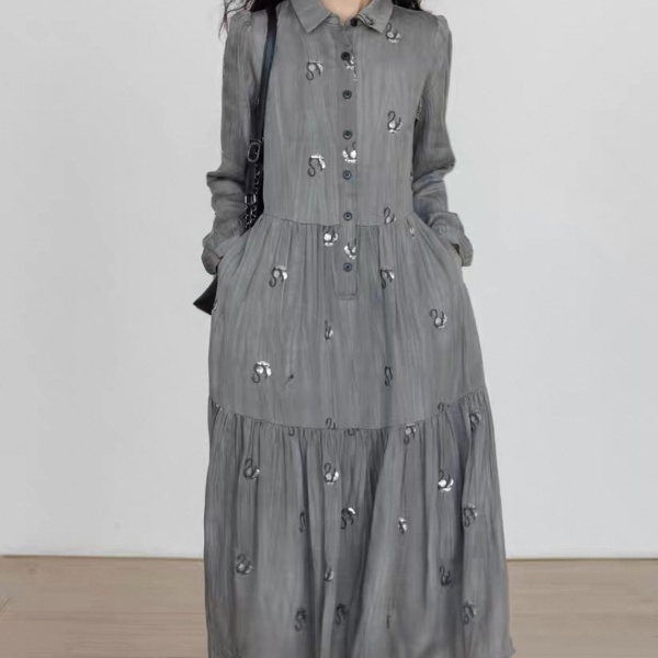 Vastand グレー スワン スパンコール 襟付き フロントボタン シャツワンピース ロングワンピース 長袖 ブラウスワンピース マキシワンピース ワンホンが入荷しました。