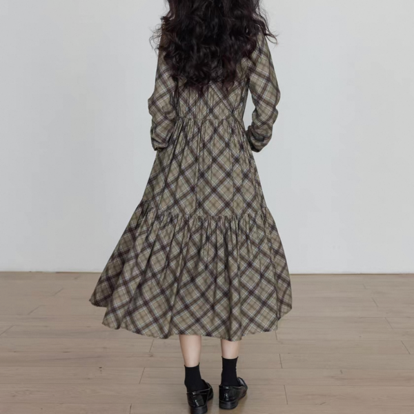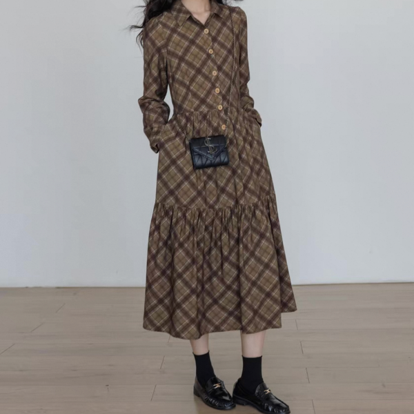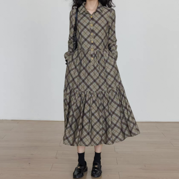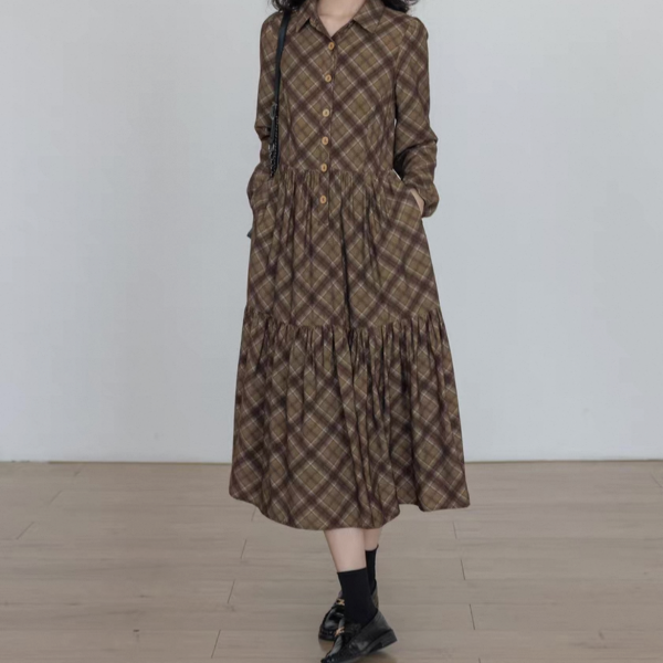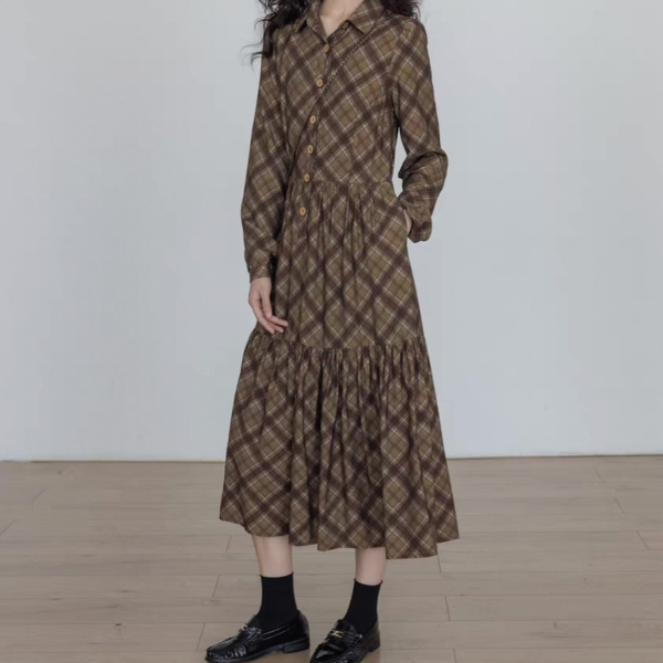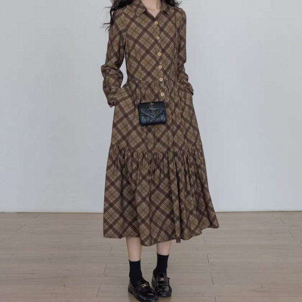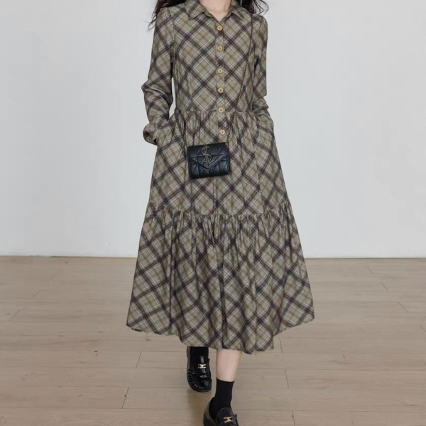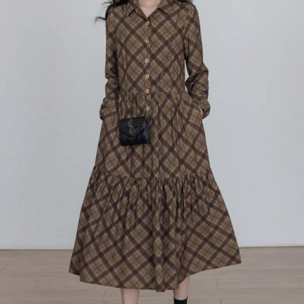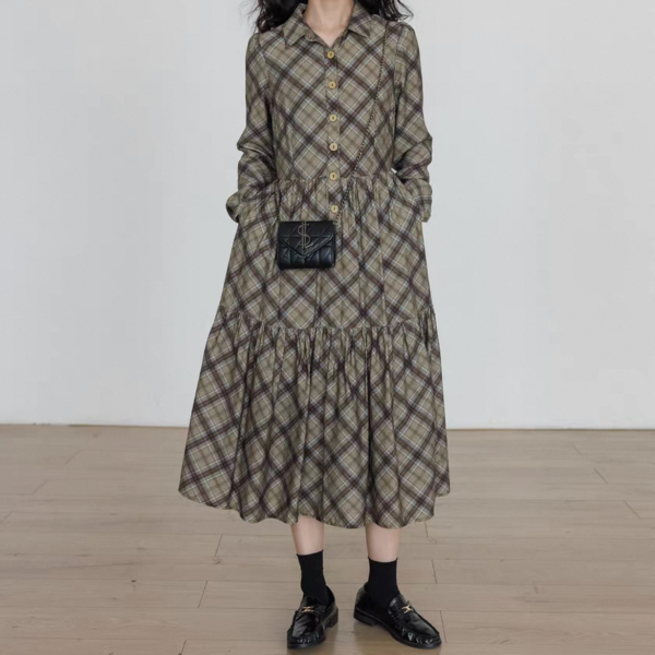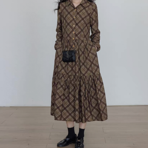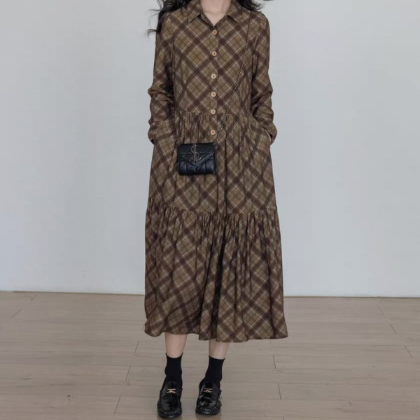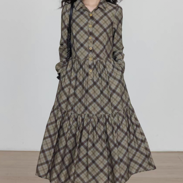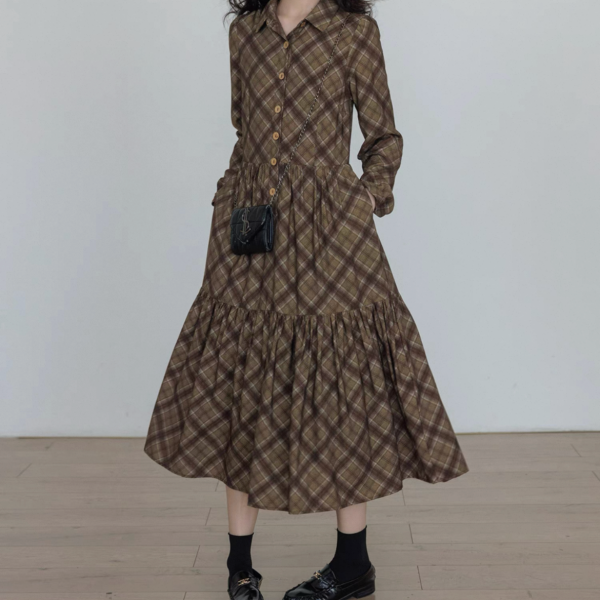 【大特価】Vastand 2色展開 チェック柄 シャツワンピース ロングワンピース マキシワンピース 長袖 ブラウスワンピース ワンホン インポート 通販