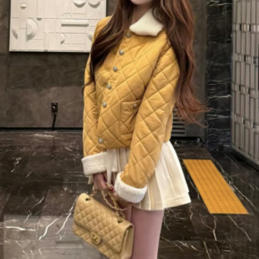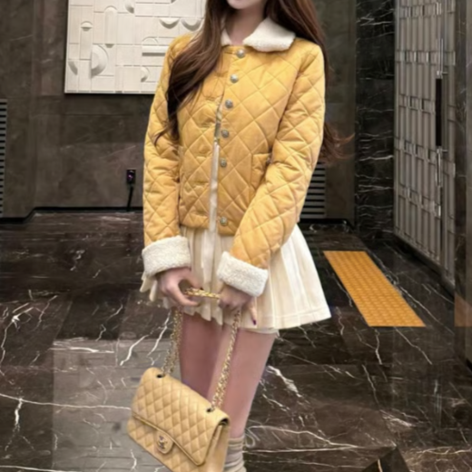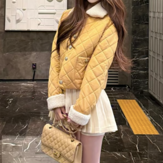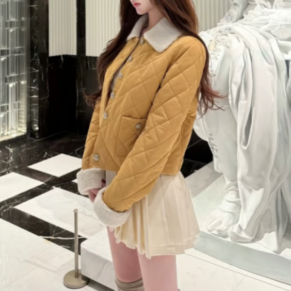 【大特価】マスタードイエロー 襟付き ボアカラー 異素材切替 キルティングジャケット フロントボタン ダブルポケット 韓国 インポート 通販