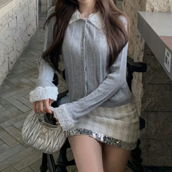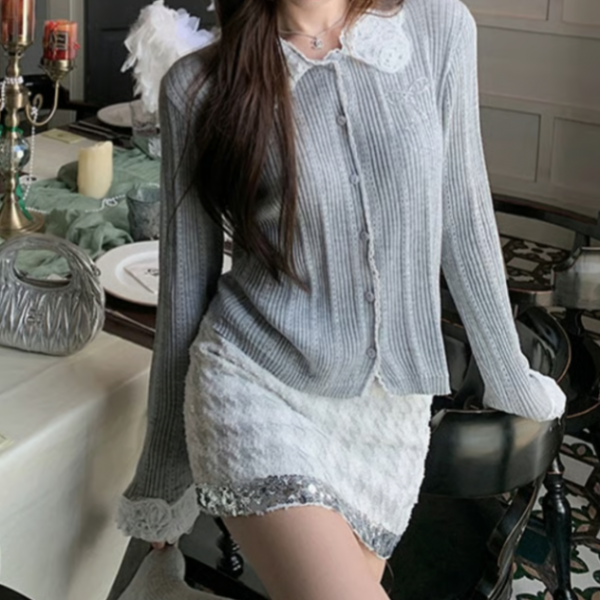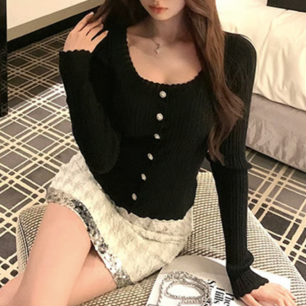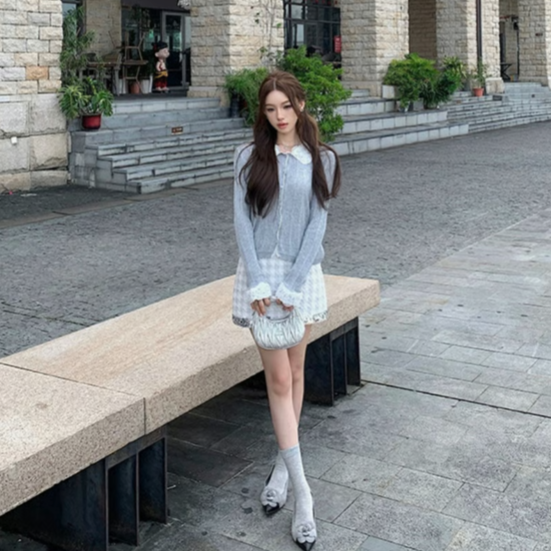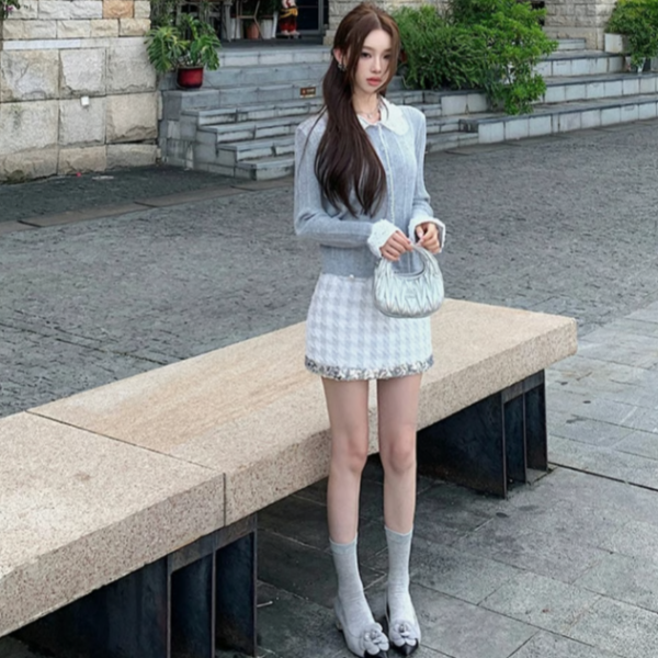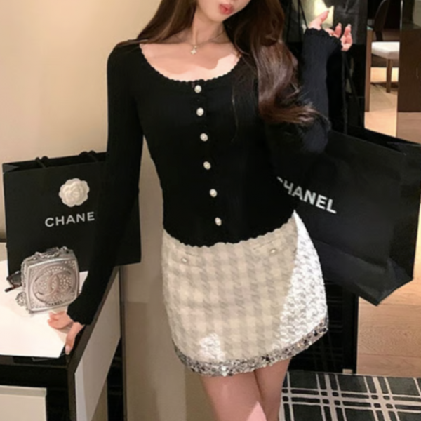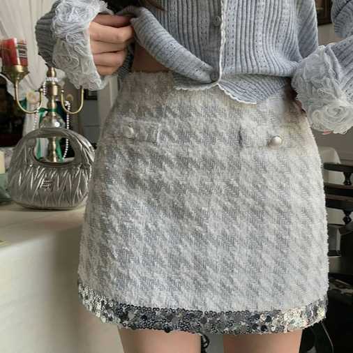 グレー 千鳥格子柄 パールボタン ツイード調 タイトミニスカート ハイウエストスカート スパンコール が入荷しました。
