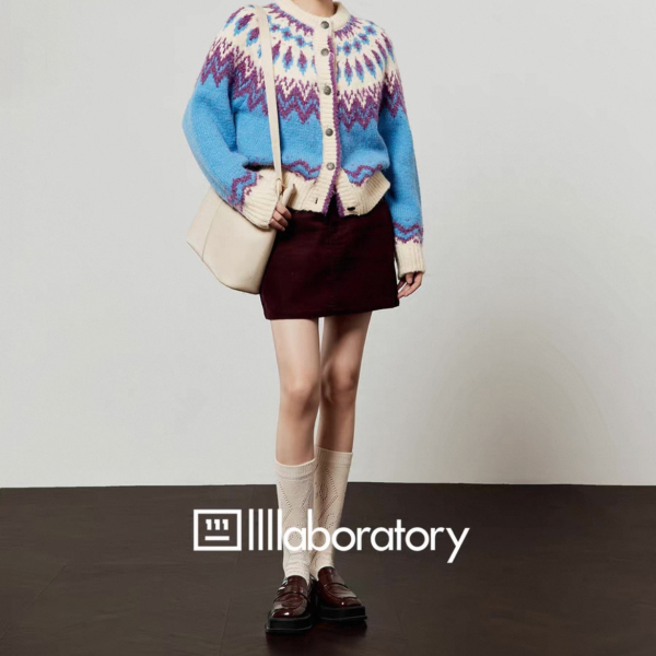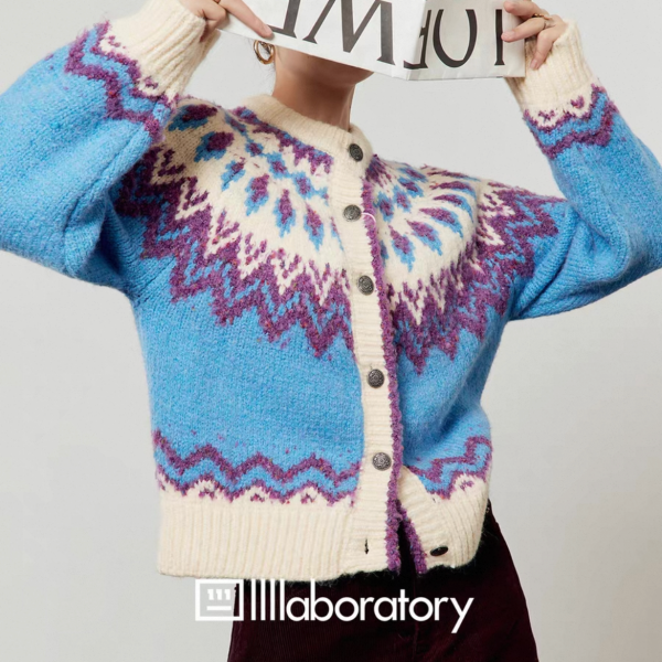 LLL LAB ブルーxパープル ノルディック柄 クルーネック ニットカーディガン セーター トップス ワンホンが入荷しました。