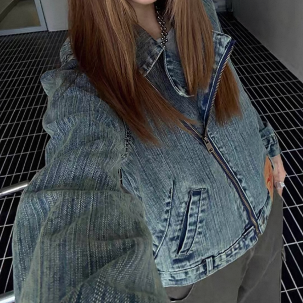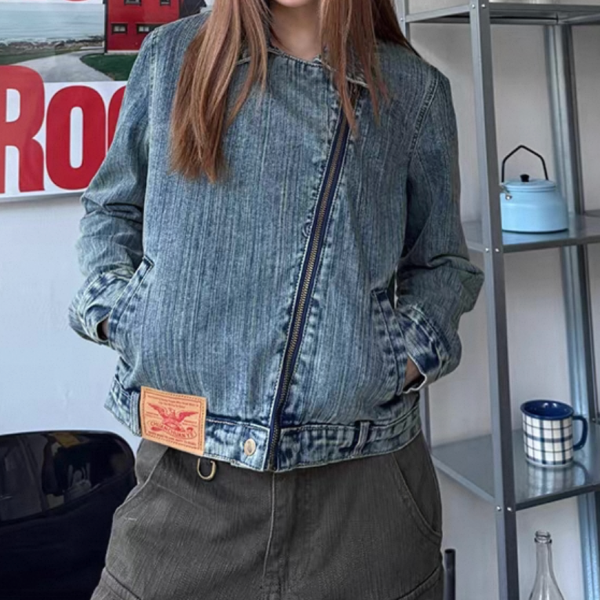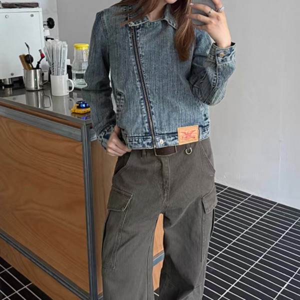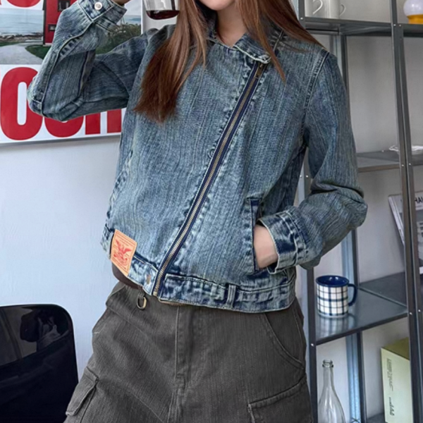 CCYE ブルー ビンテージ風 襟付き ジッパー ジップアップ ファスナー デニムジャケット デニムライダースジャケット ワンホンが入荷しました。