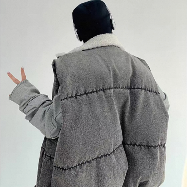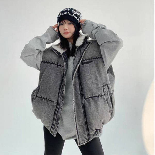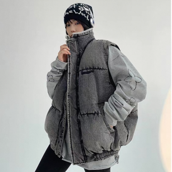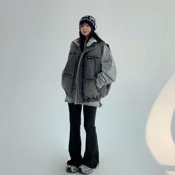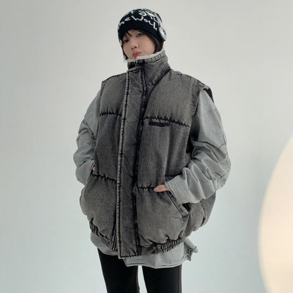 Youlaile studio RICE CAKE OISIS ブラック ウォッシュ加工 ビンテージ風 スタンドカラー デニムダウンベスト パファーベスト ワンホンが入荷しました。