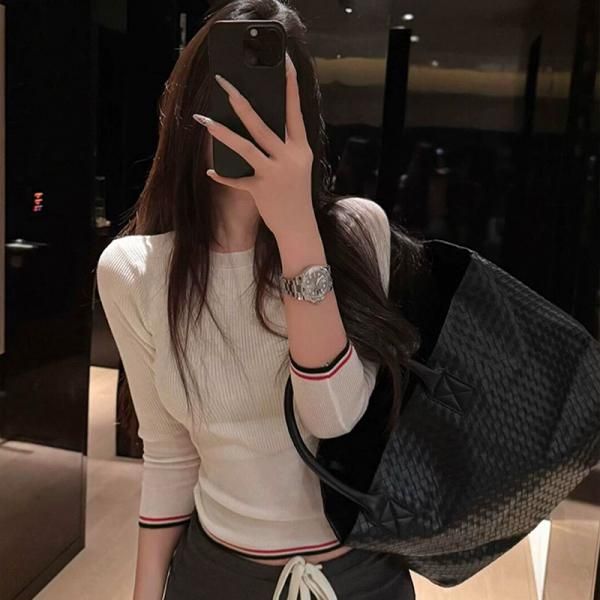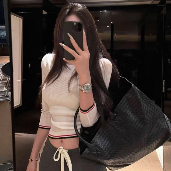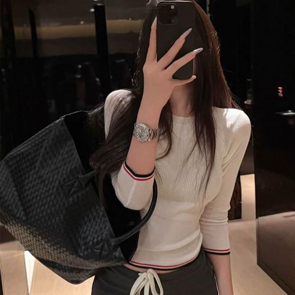 ホワイト トリコロールカラー ライントリム 七分袖 リブデザイン クルーネック トップス カットソー ニット セーターが入荷しました。