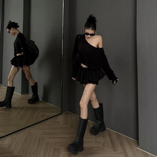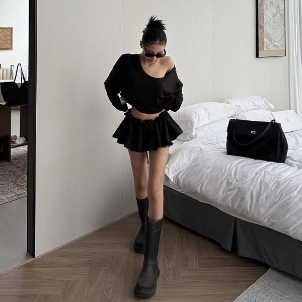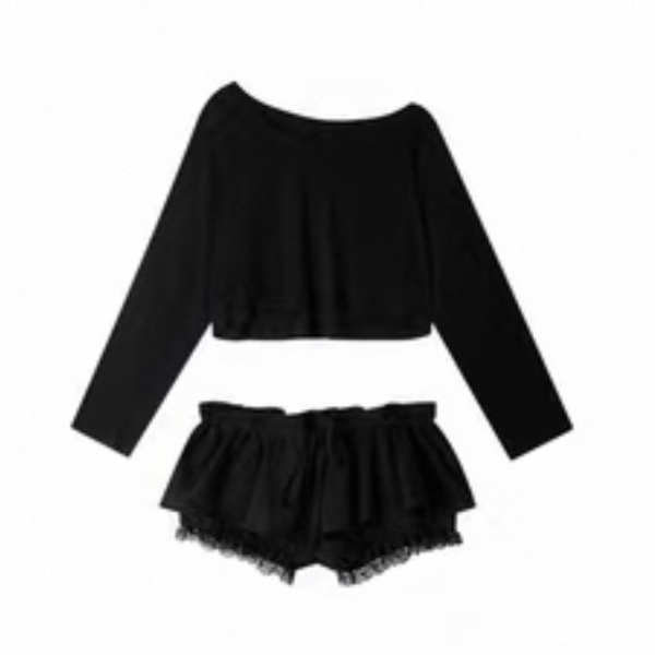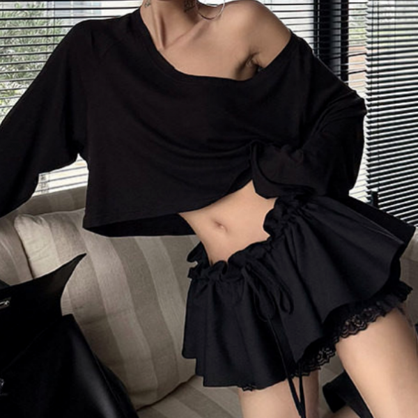 ZERO STORE ブラック ワンショルダー オフショルダー 長袖 クロップドトップス カットソー レース切替 ショートパンツ キュロット セットアップ ワンホンが入荷しました。