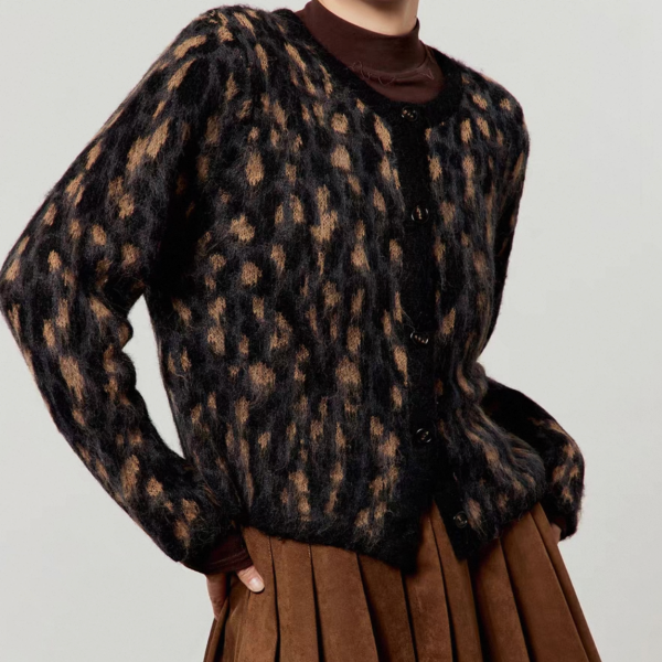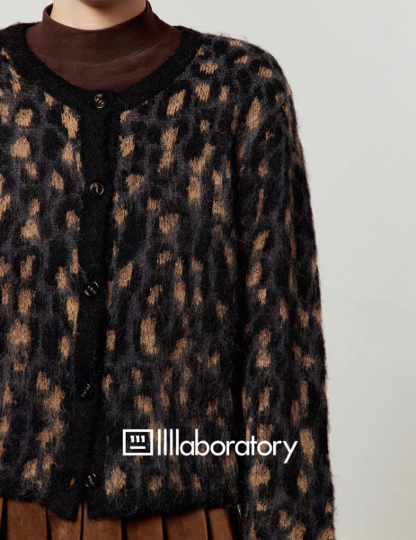 LLL LAB ブラウン レオパード柄 ひょう柄 モヘア フェイクファー クルーネック ショート丈 ニットカーディガン セーター トップス ワンホン が入荷しました。