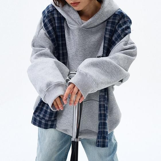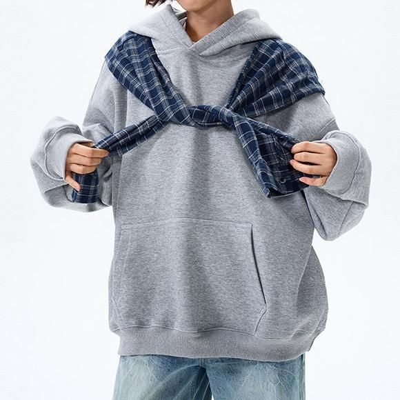 H GANG X レイヤード 重ね着風 チェック柄 異素材切替 スウェット トレーナー プルオーバー パーカー フーディー トップス ワンホンが入荷しました。