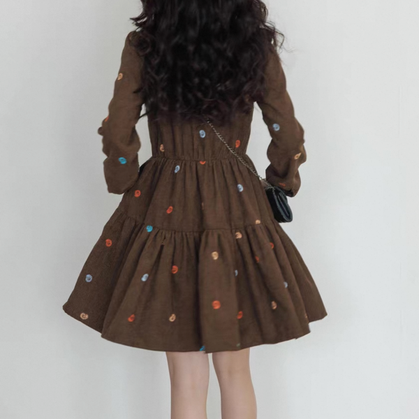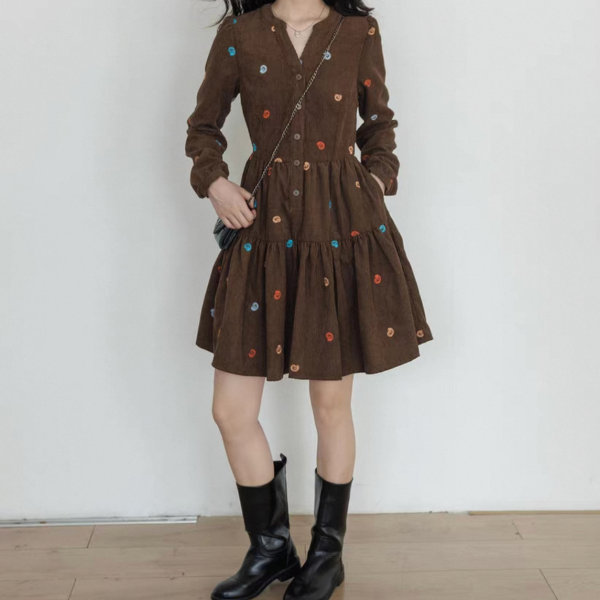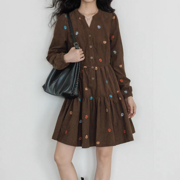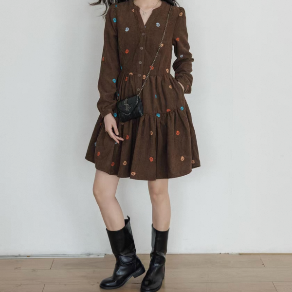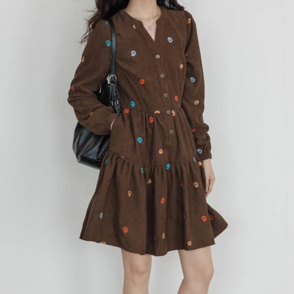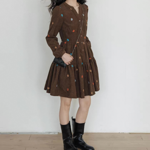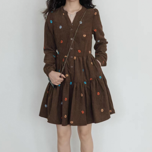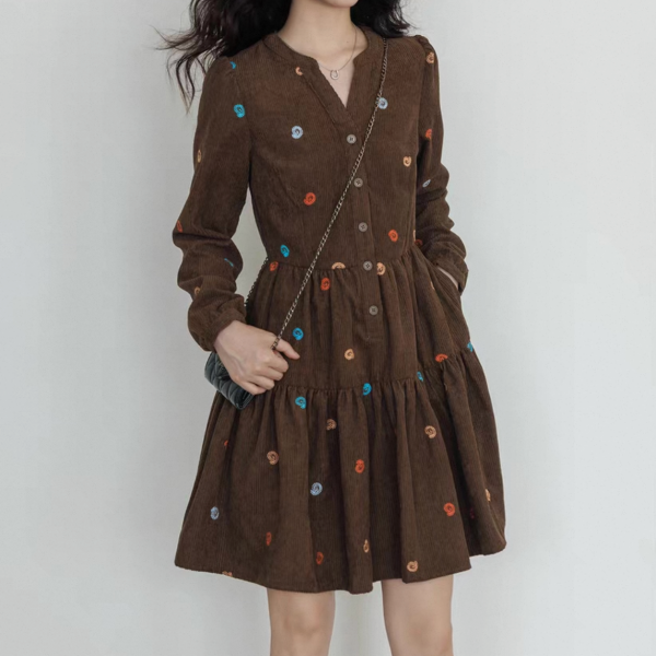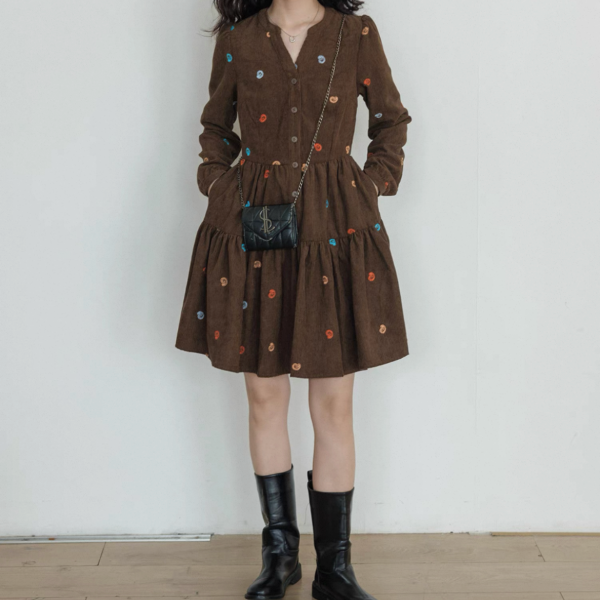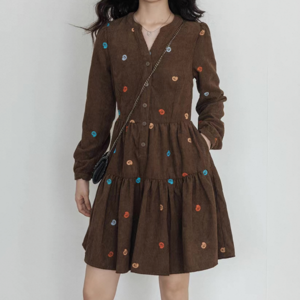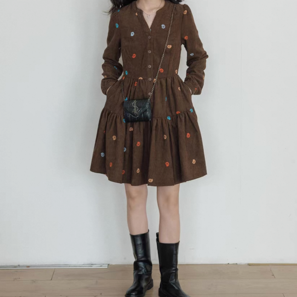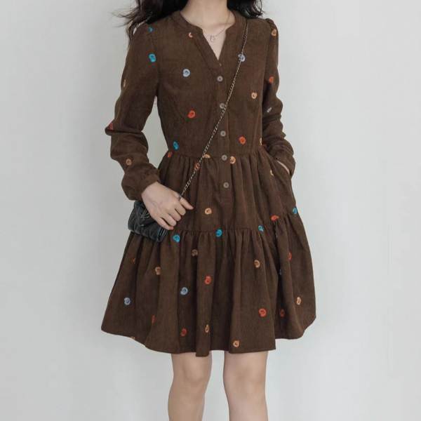 vastand ブラウンxマルチカラー 刺繍デザイン Vネック 長袖 ブラウスワンピース シャツワンピース ミニワンピース ペイズリー柄 コーデュロイワンピース ワンホンが入荷しました。