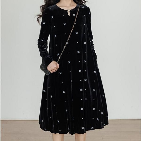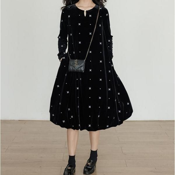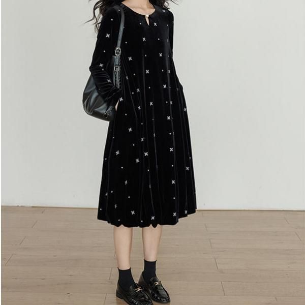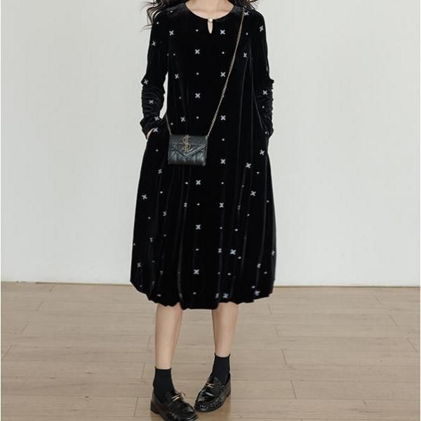 vastand ブラック ベロア ベルベット 刺繍デザイン パールボタン Vネック 長袖 ロングワンピース フレアワンピース ベロアワンピース ワンホンが入荷しました。
