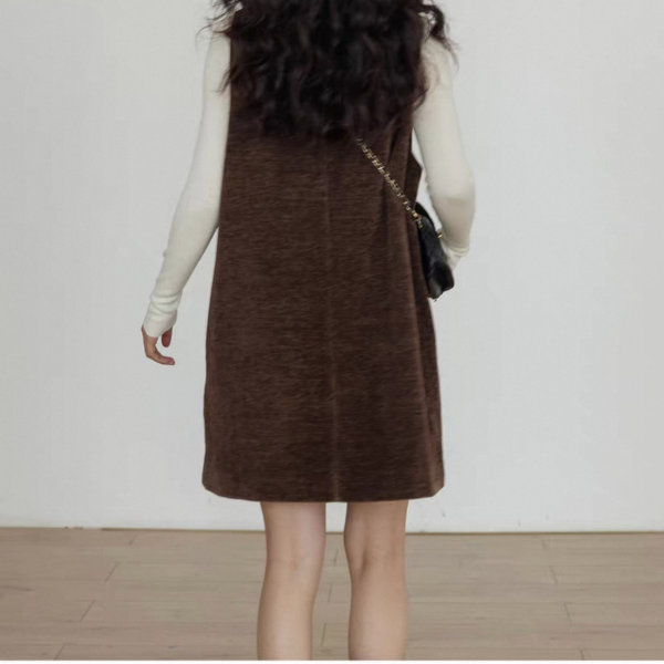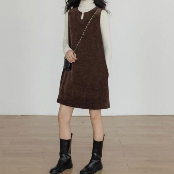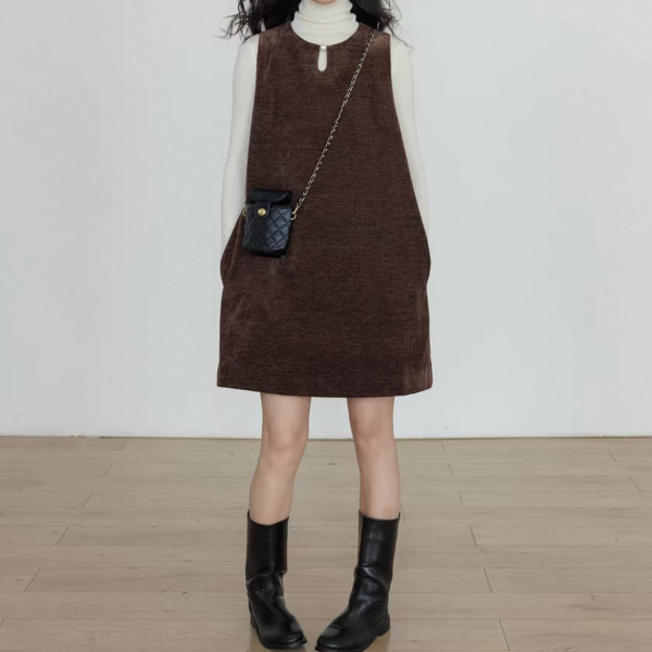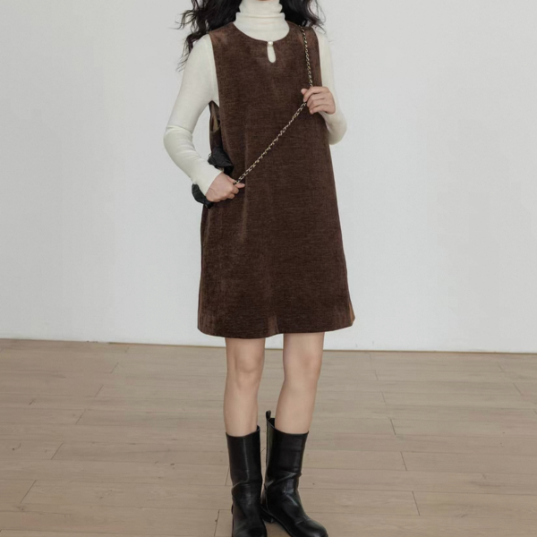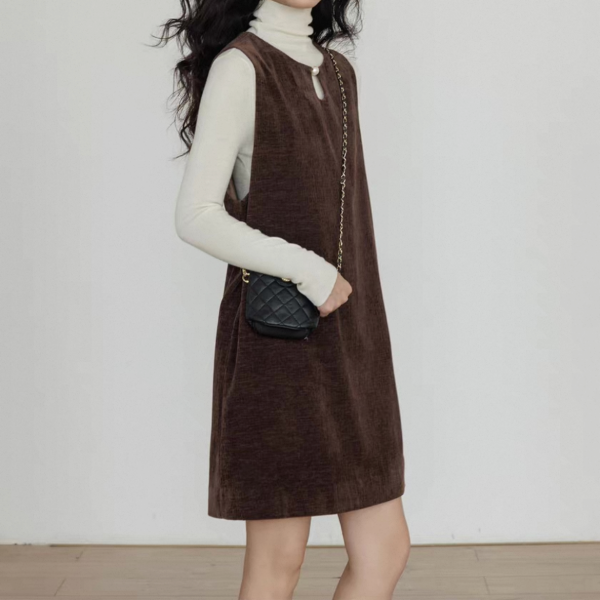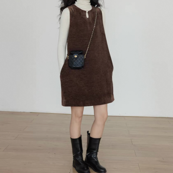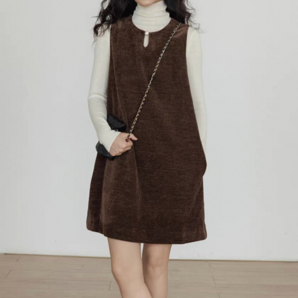 【大特価】vastand ブラウン ベロア ベルベット パールボタン ラウンドネック タンクトップ ノースリーブ シフトワンピース ミニワンピース ワンホン