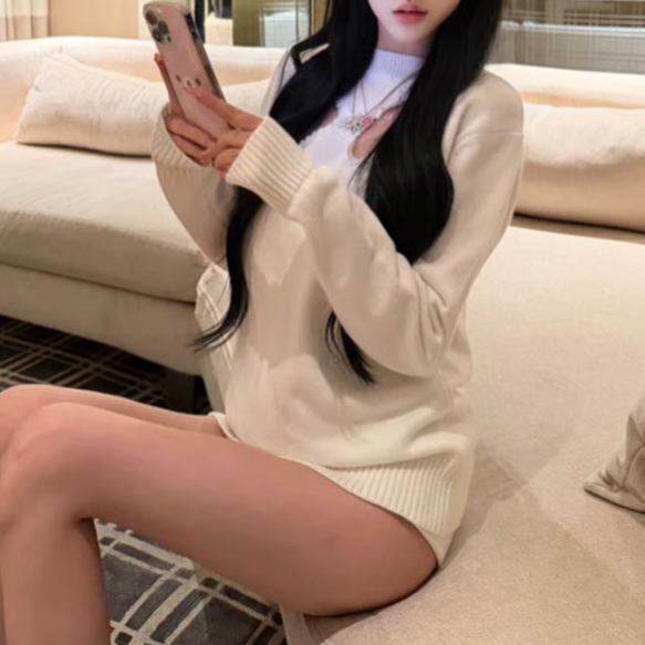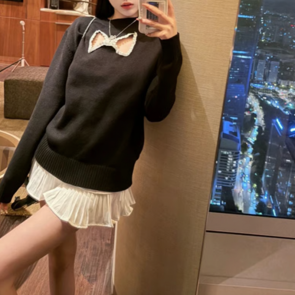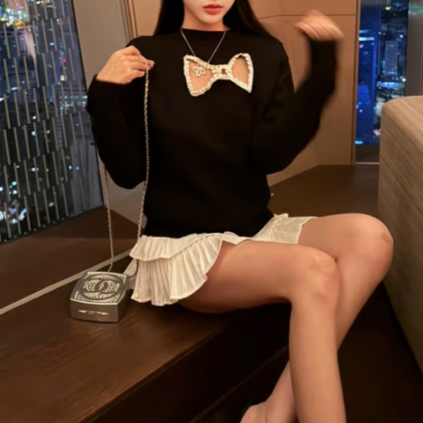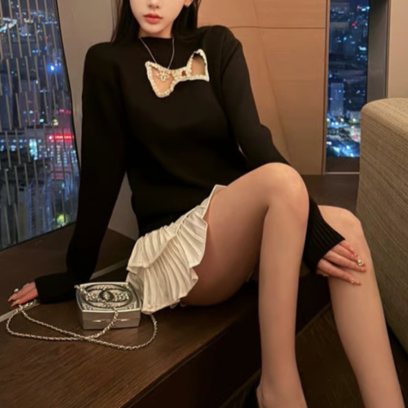 【大特価】2色展開 カットアウト リボン モックネック 長袖 ニット セーター トップス カットソー 韓国 インポート 通販