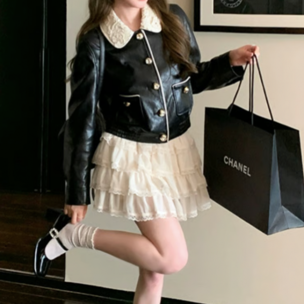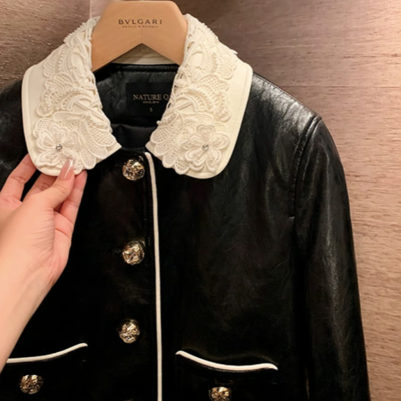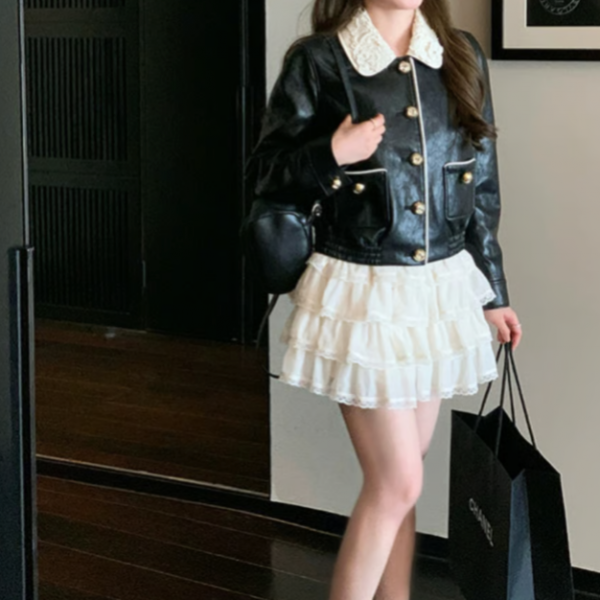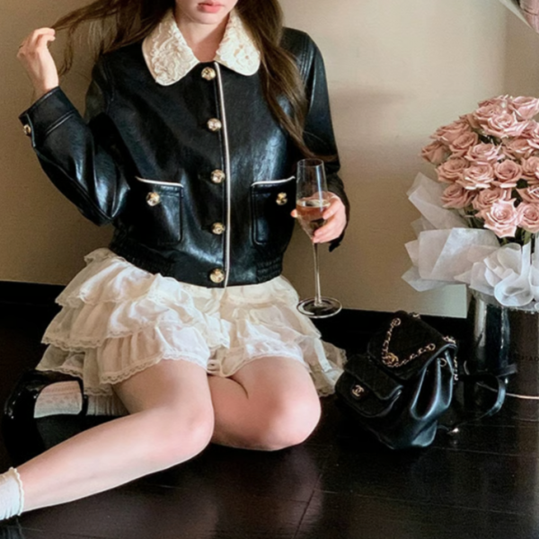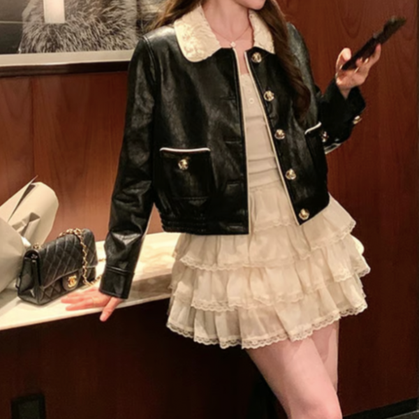 ブラック レース襟 異素材切替 フロントボタン フェイクレザー 合皮 レザージャケット レザーブルゾン が入荷しました。