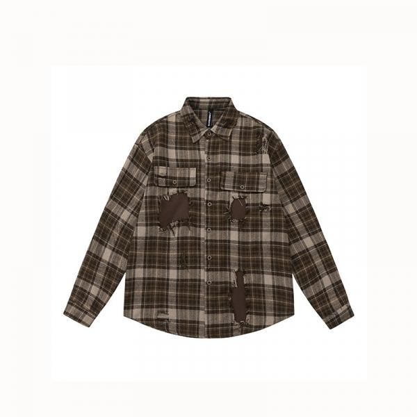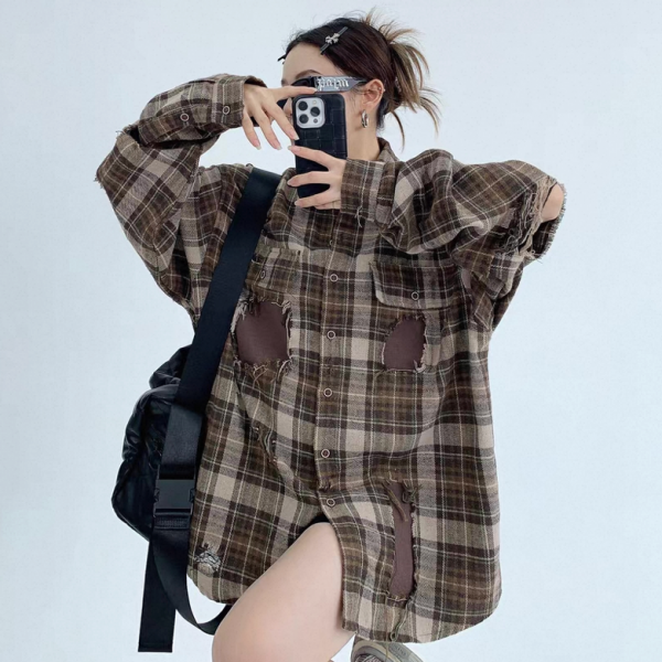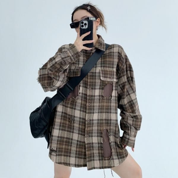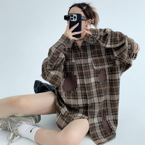 Youlaile studio RICE CAKE OISIS ブラウン フリンジトリム リメイク風デザイン 長袖 チェックシャツ チェックシャツ オーバーサイズ シャツ ブラウス トップス カットソー ワンホンが入荷しました。