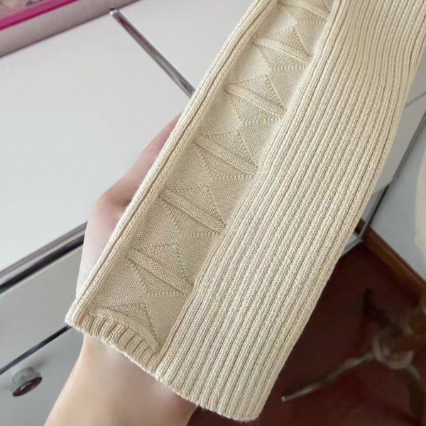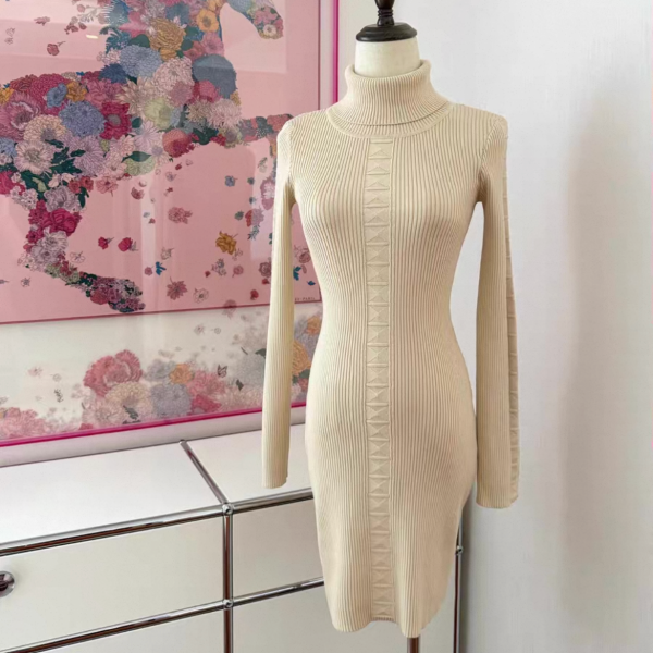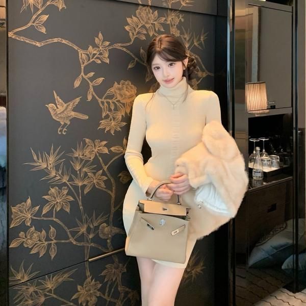 【大特価】ベージュ 無地 シンプル エンボス加工 タートルネック ハイネック 長袖 ニットワンピース タイトワンピース タイトミニワンピース 韓国