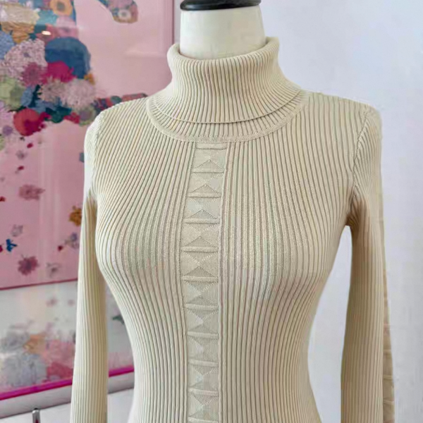 ベージュ 無地 シンプル エンボス加工 タートルネック ハイネック 長袖 ニットワンピース タイトワンピース タイトミニワンピースが入荷しました。