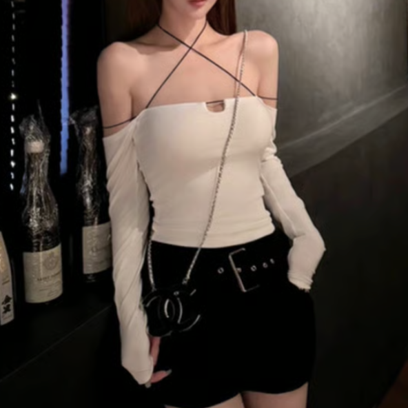 ホワイト 無地 シンプル モノトーン クロスストラップ ホルターネック オフショルダー 長袖 スパゲッティーストラップ トップス カットソーが入荷しました。