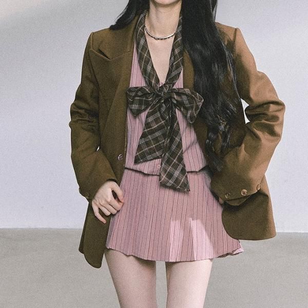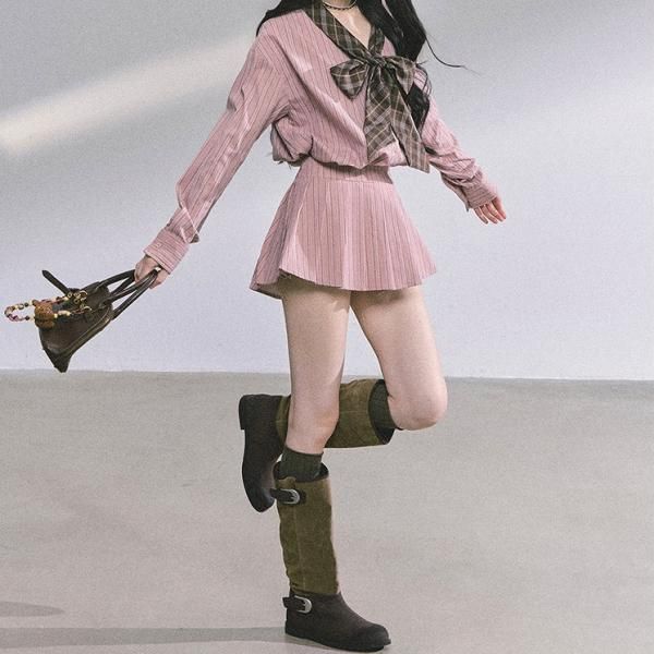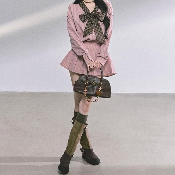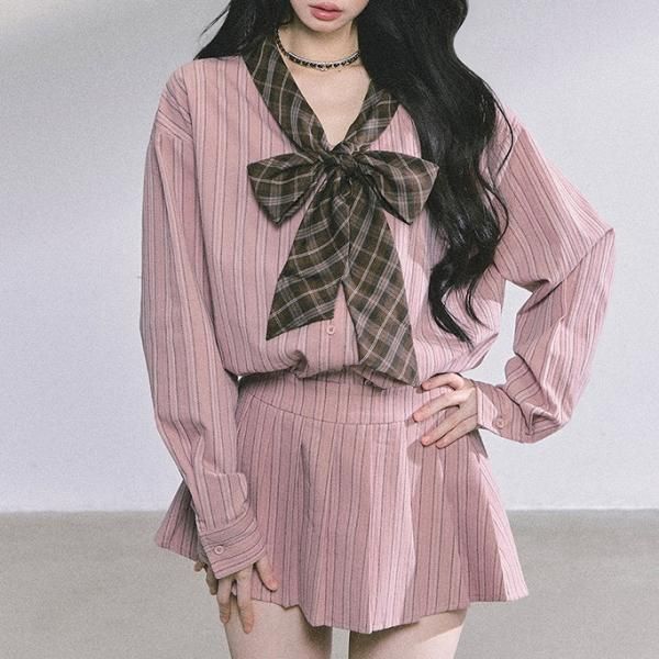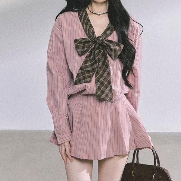 LAE STUDIO ピンク ピンストライプ柄 ボウタイシャツワンピース フロントリボン ブラウスワンピース ミニワンピース ワンホン が入荷しました。