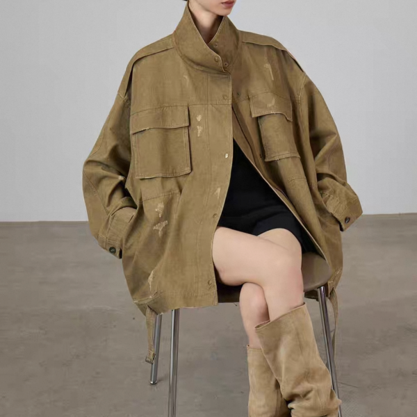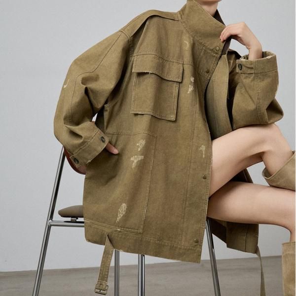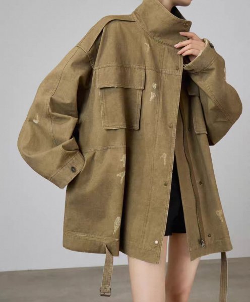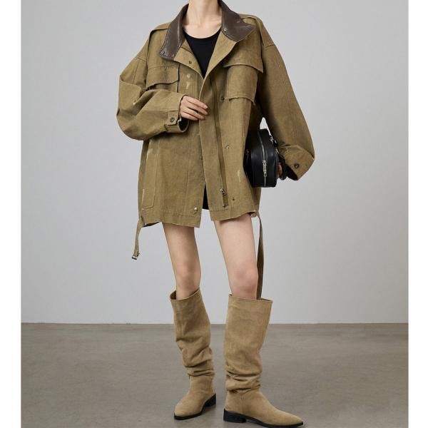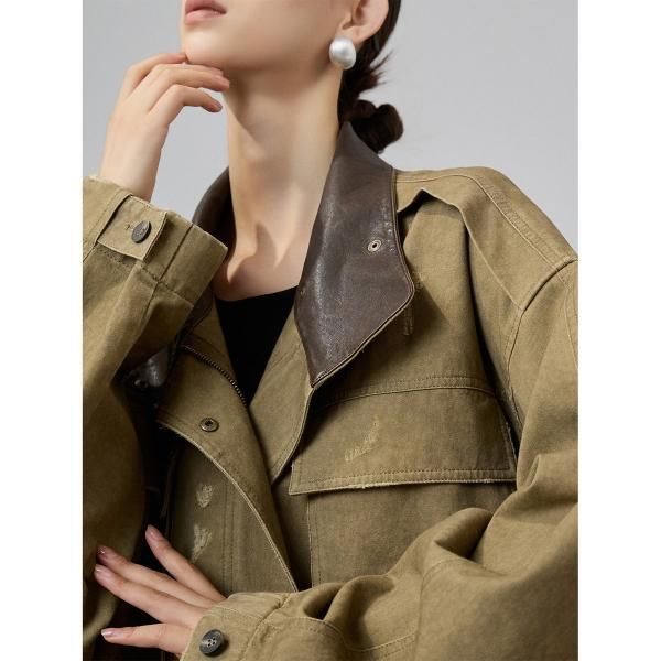 SHUYIN ベージュ レザーカラー 異素材切替 スタンドカラー Aライン ダブルポケット ワークジャケット ワークブルゾン ワンホンが入荷しました。