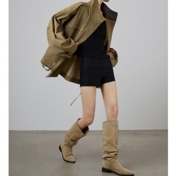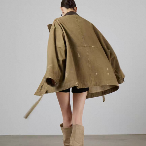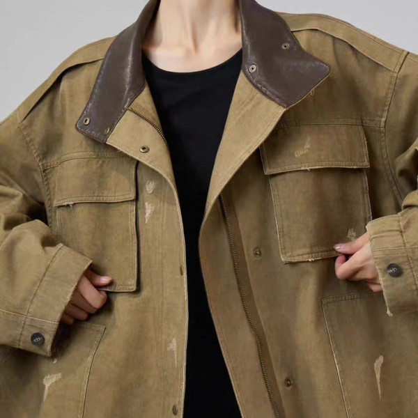 【大特価】 SHUYIN ベージュ レザーカラー 異素材切替 スタンドカラー Aライン ダブルポケット ワークジャケット ワークブルゾン ワンホン