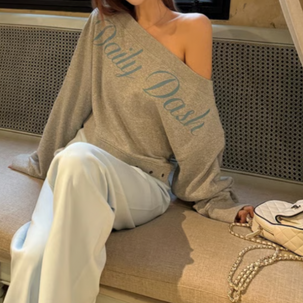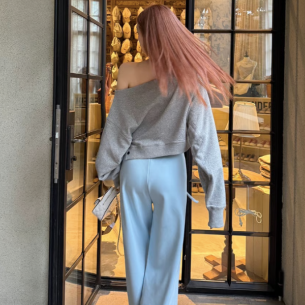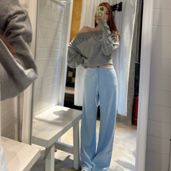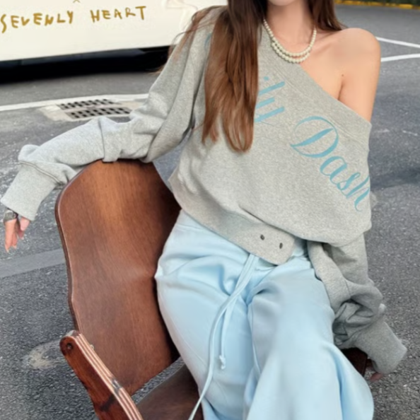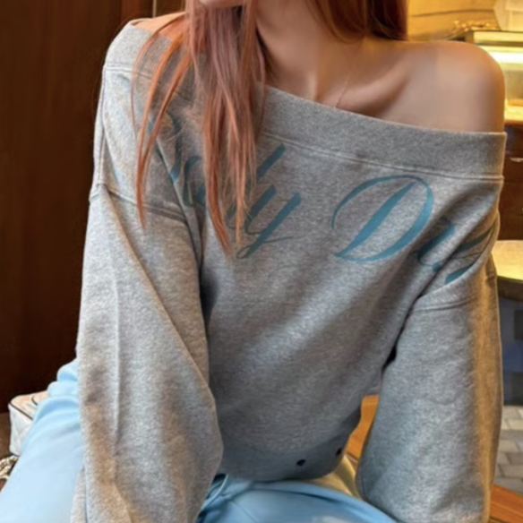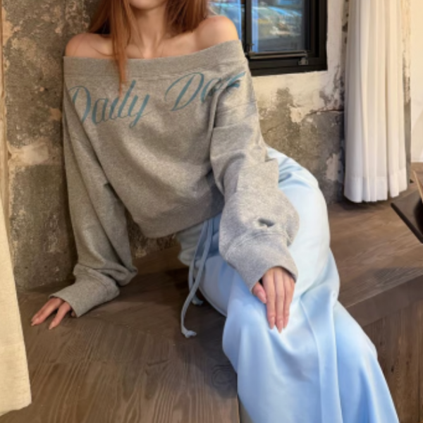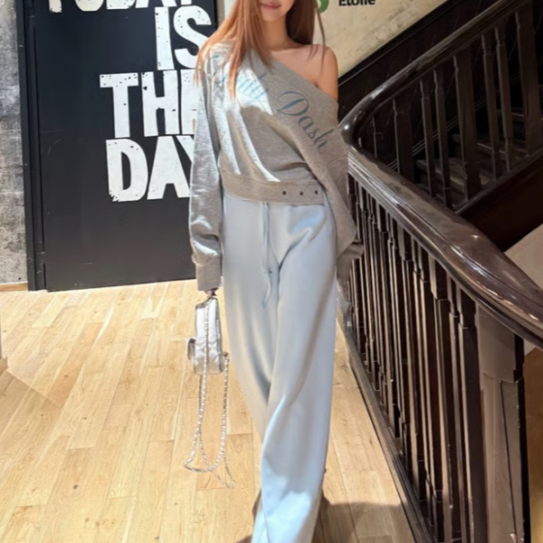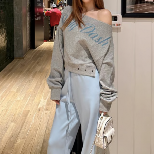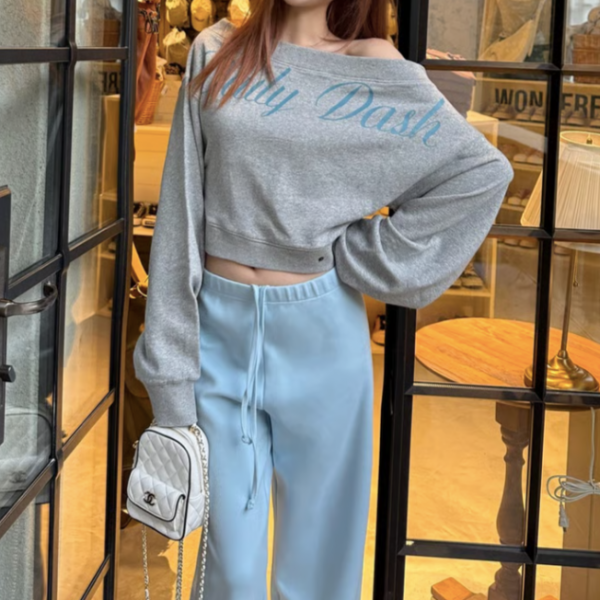 【大特価】ライトグレーxブルー Daily Dash フロントロゴ オフショルダー スウェット トップス 長袖 ロングパンツ フレアパンツ セットアップ 韓国