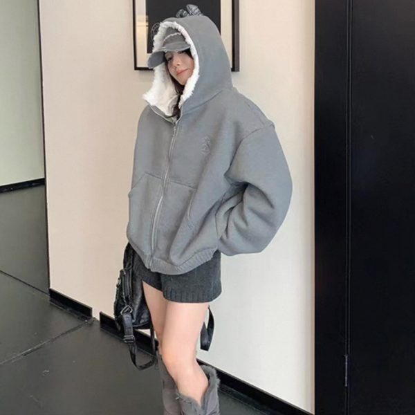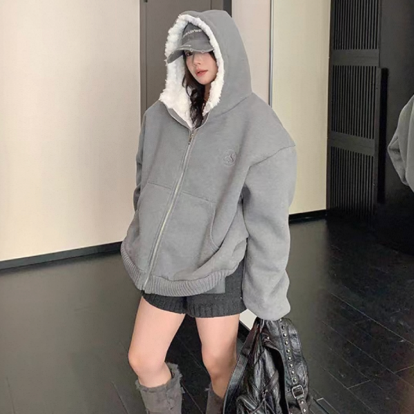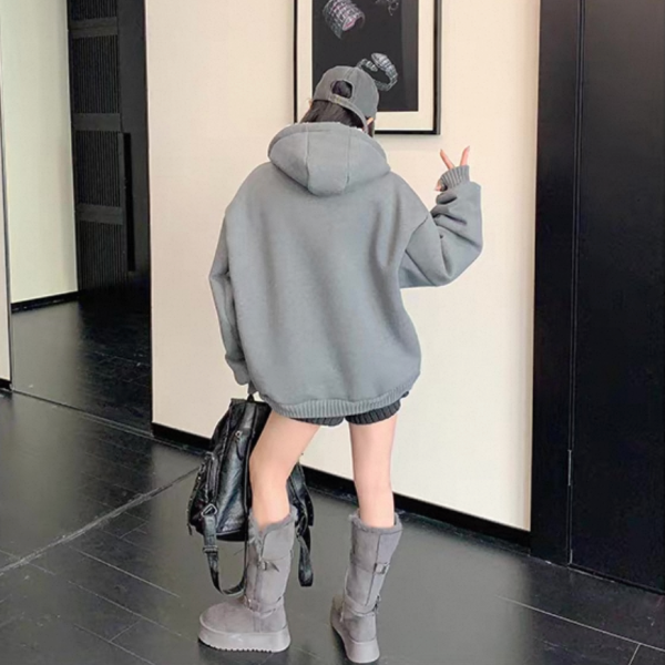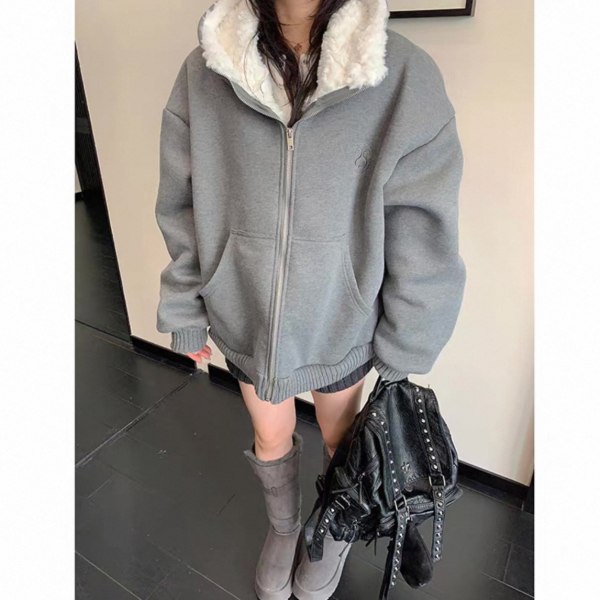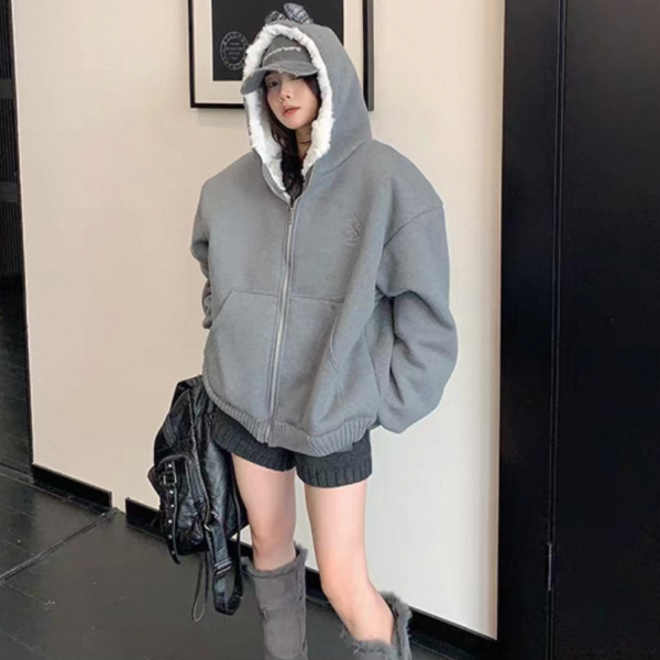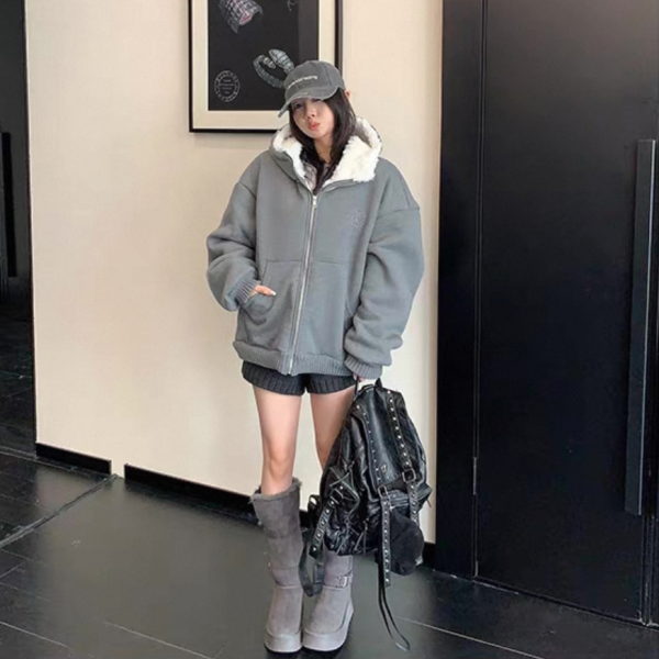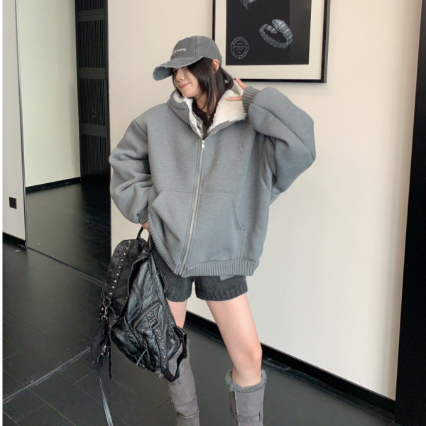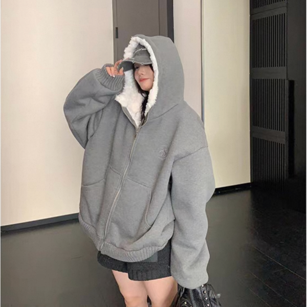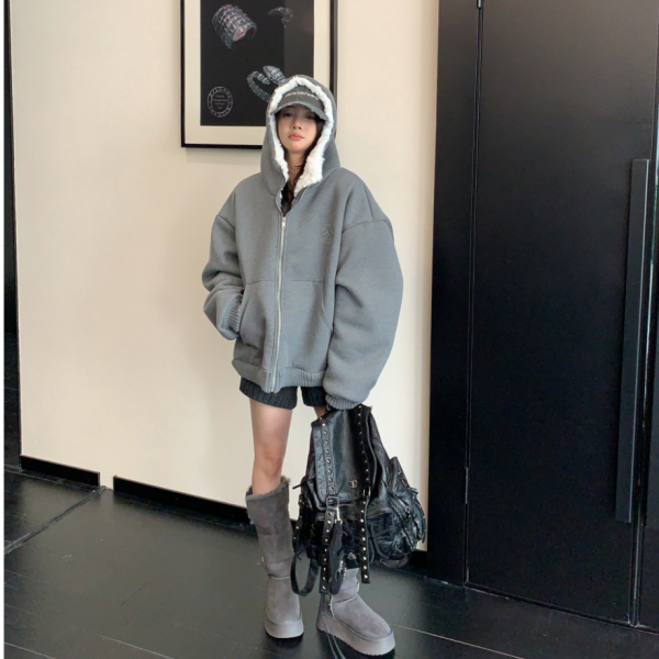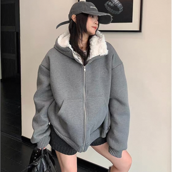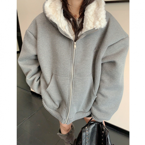 Youlaile studio RICE CAKE OISIS グレー インナーボア パーカー フーディー オーバーサイズ ジッパー ジップアップ ファスナー ジャケット リブニット切替 ワンホンが入荷しました。