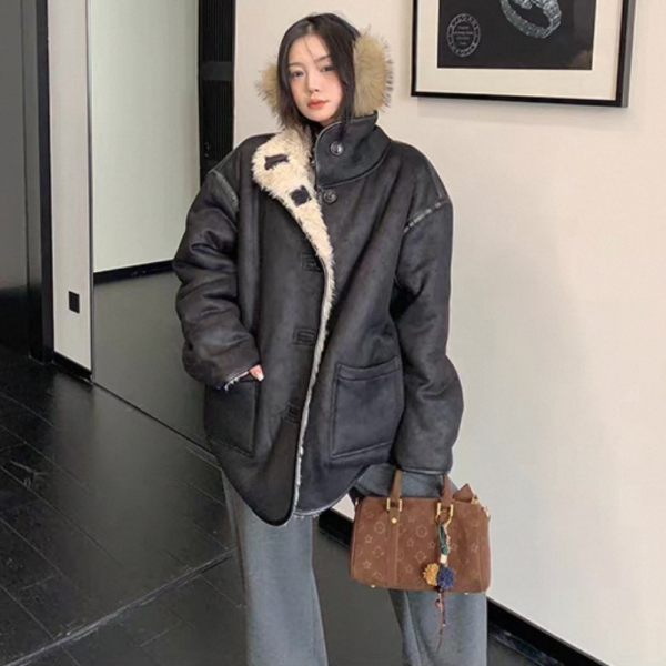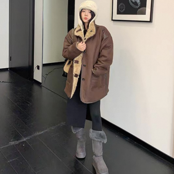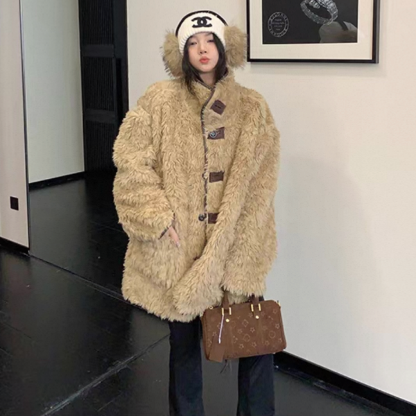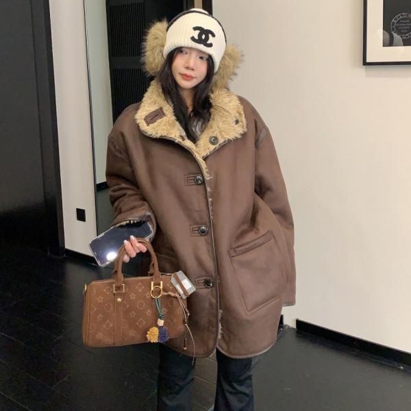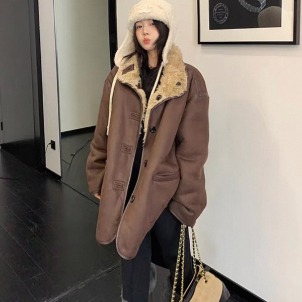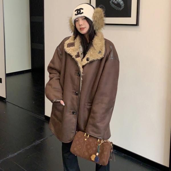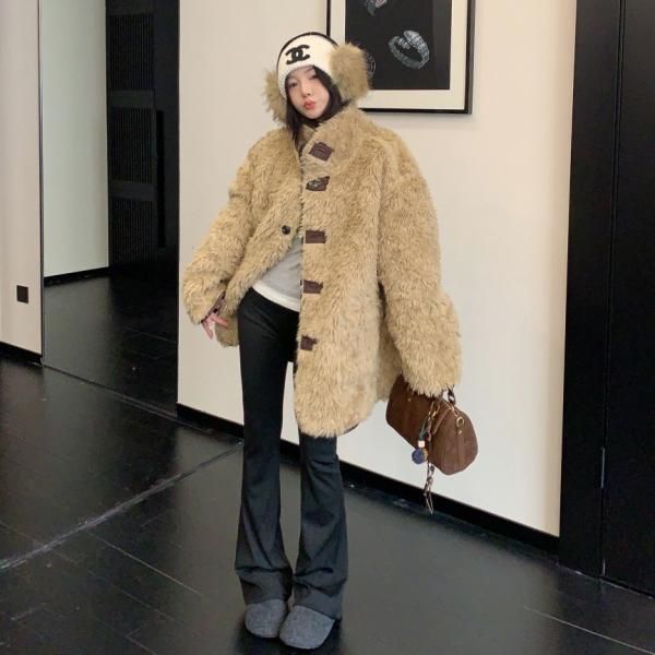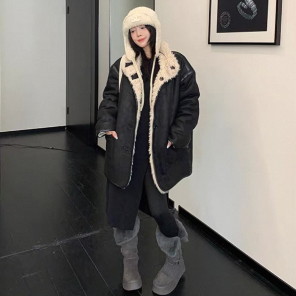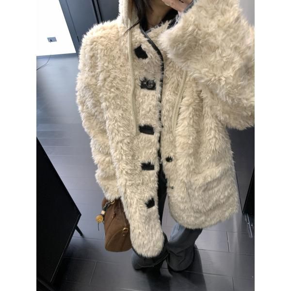 【大特価】Youlaile studio RICE CAKE OISIS 2色展開 リバーシブル 2way ミドル丈 フェイクファージャケット レザージャケット フロントボタン ワンホン