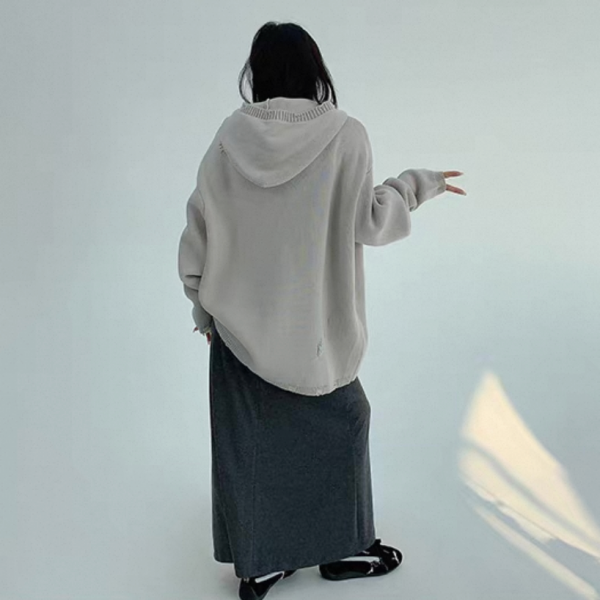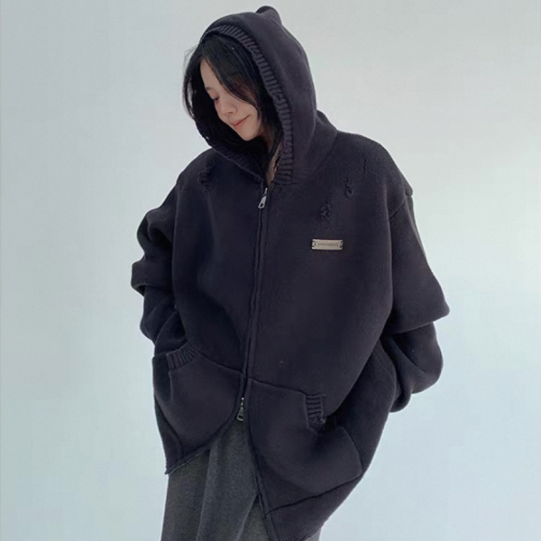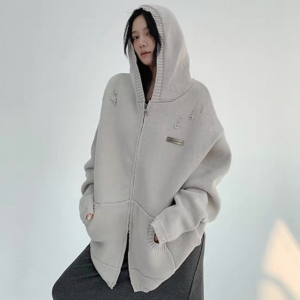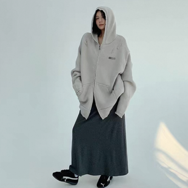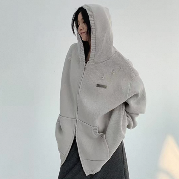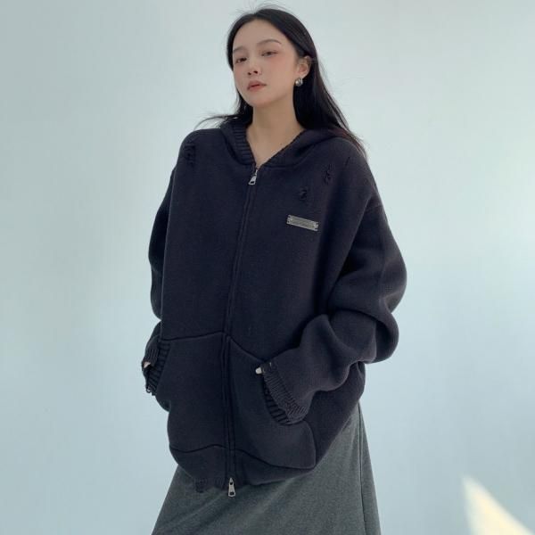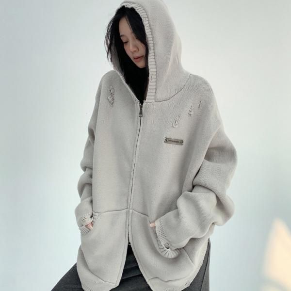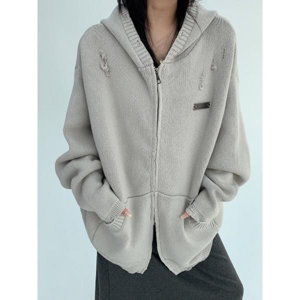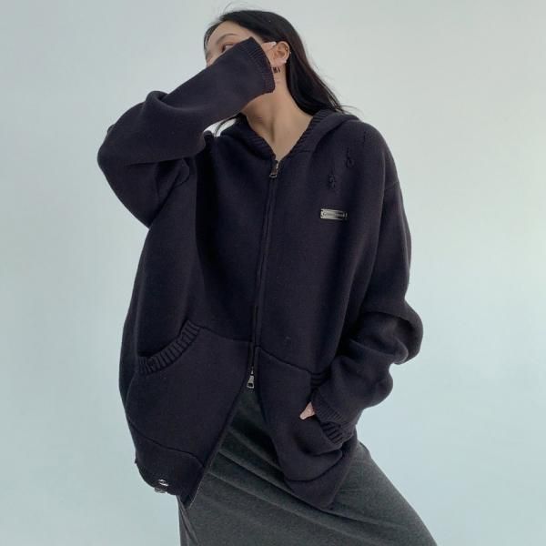 Youlaile studio RICE CAKE OISIS 2色展開 ダブルジッパー ジップアップ ダブルジップ ビンテージ風 古着風 ブロークン ダメージ加工 クラッシュ加工 ファスナー ファスナー ニットパーカー ニットジャケット フーディー ワンホンが入荷しました。