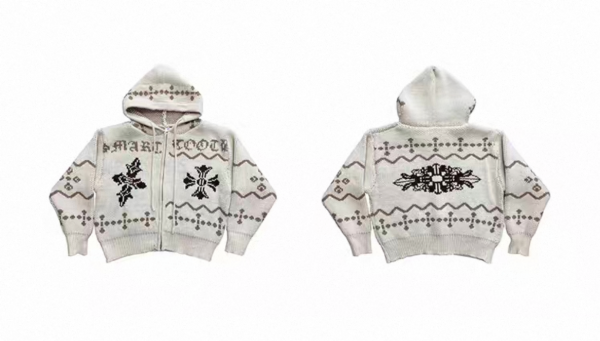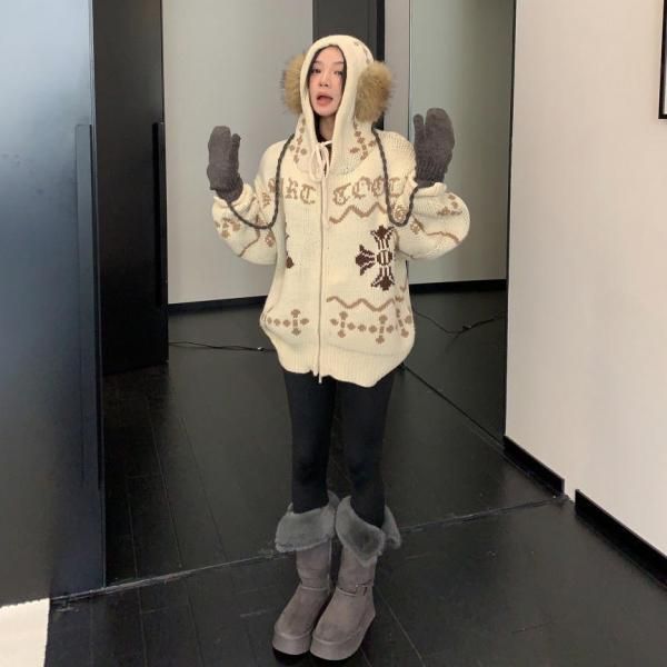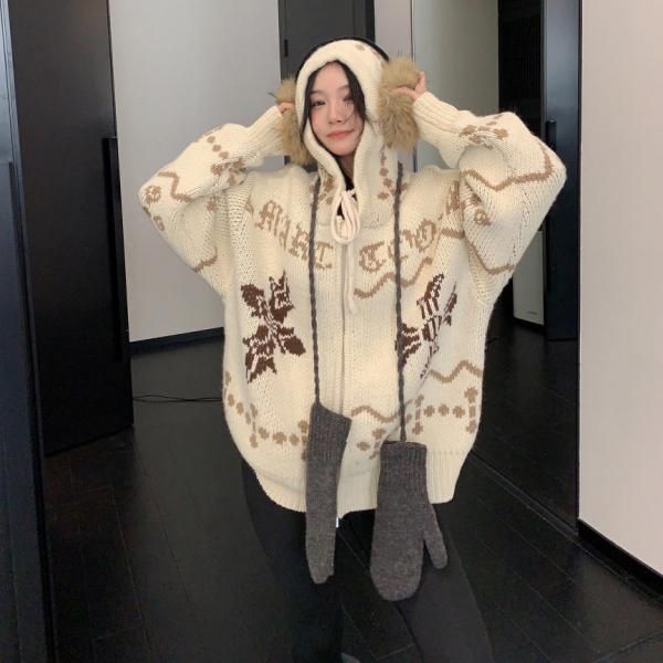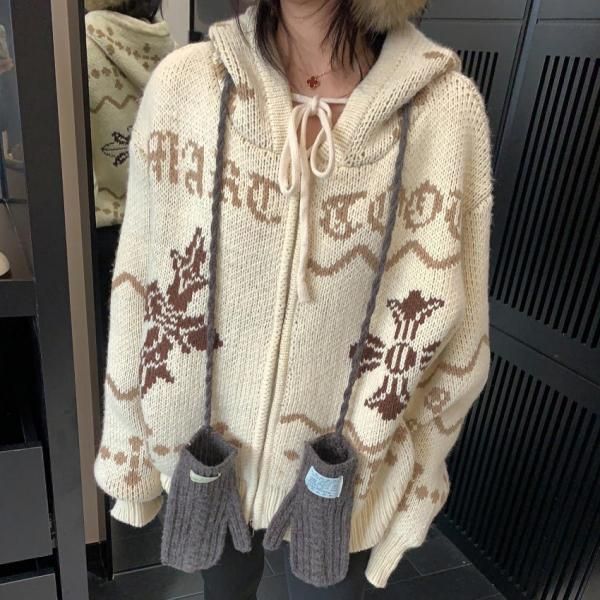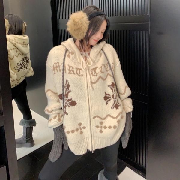 【大特価】Youlaile studio RICE CAKE OISIS ベージュ クロス 十字架 フロントロゴ ニットパーカー ニットジャケット フーディー ワンホン インポート 通販