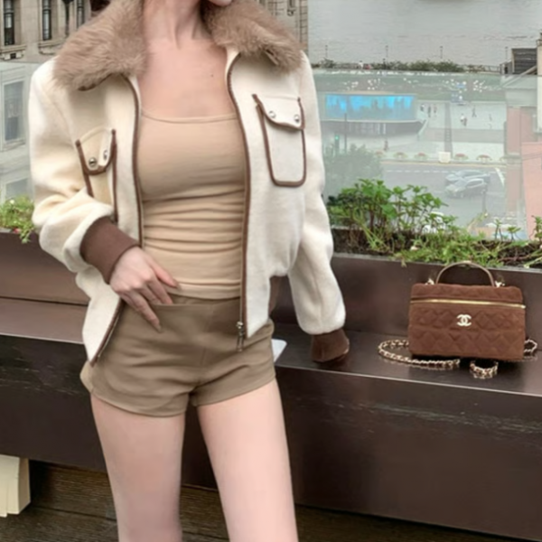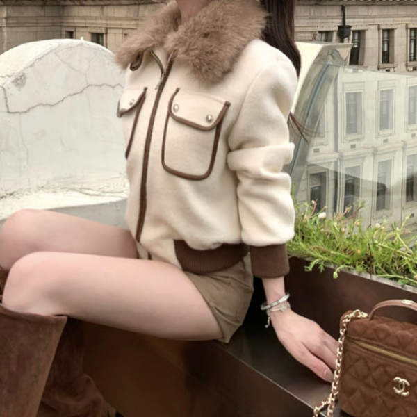 アイボリーxブラウン フェイクレザートリム パイピングトリム ダブルポケット ウール調 フェイクファーティペット ファーカラー ファー襟 ジャケットが入荷しました。