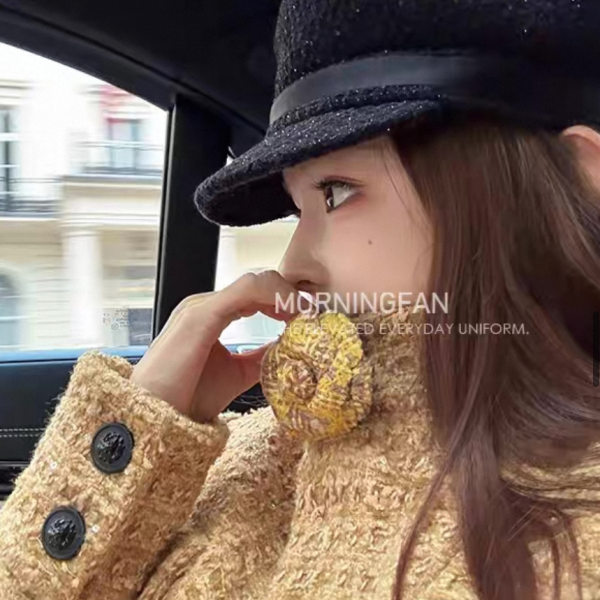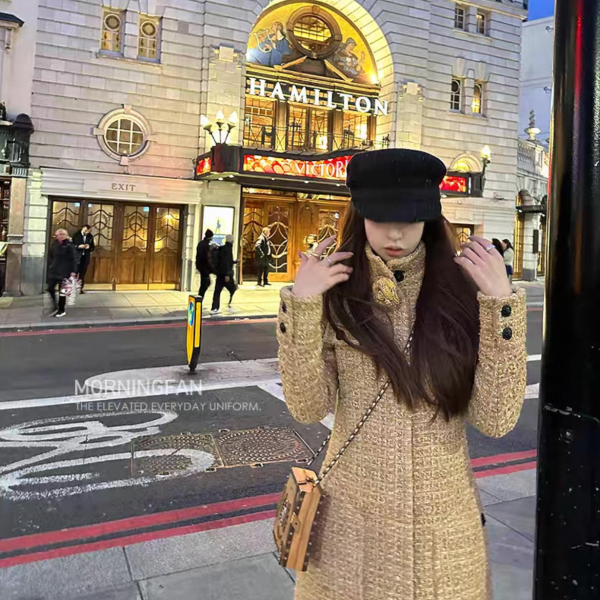 【大特価】マスタードイエロー カメリア ブローチ ミックスカラー ダブルポケット スタンドカラー ウール調 ロングコート 韓国 インポート 通販
