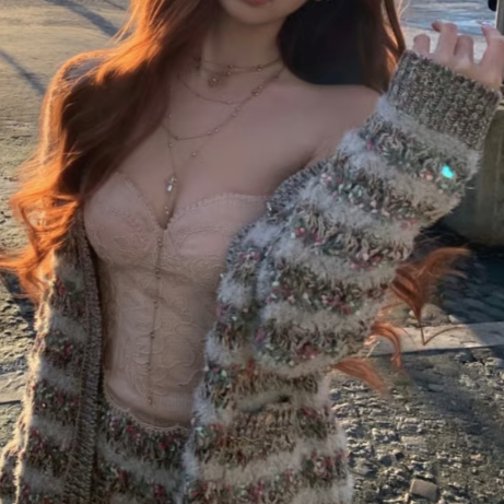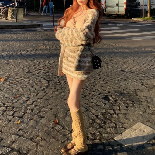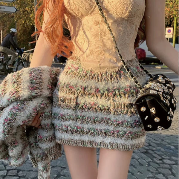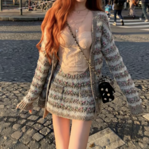 【大特価】マルチカラー ストライプ ボーダー ニットカーディガン セーター トップス ミニスカート ニットスカート セットアップ ニットアップ 韓国