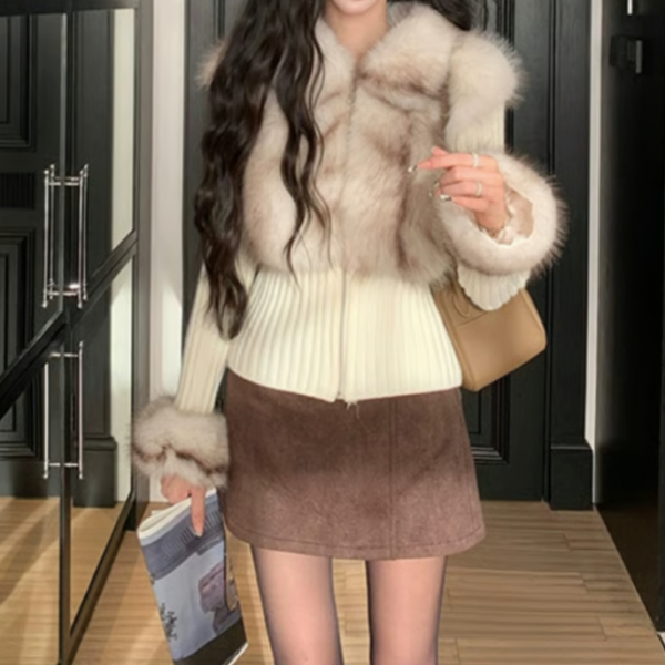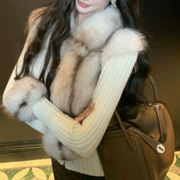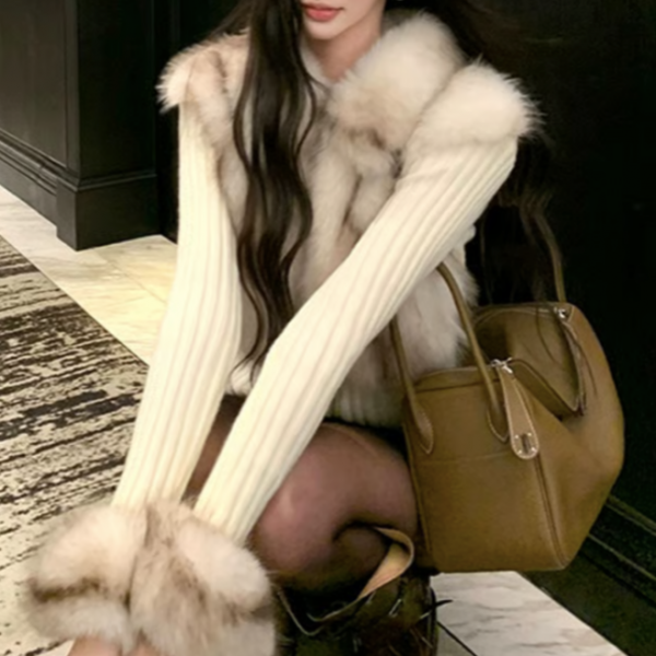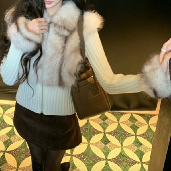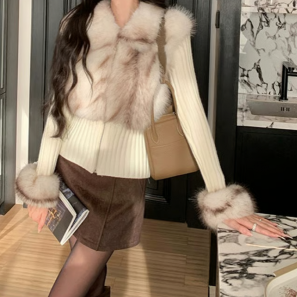 アイボリー フェイクファー 異素材切替 フェイクファーベストデザイン ファー襟 ファースリーブ 襟付き ニットジャケット フェイクファージャケット 長袖 リブニット トップス セーター カットソーが入荷しました。